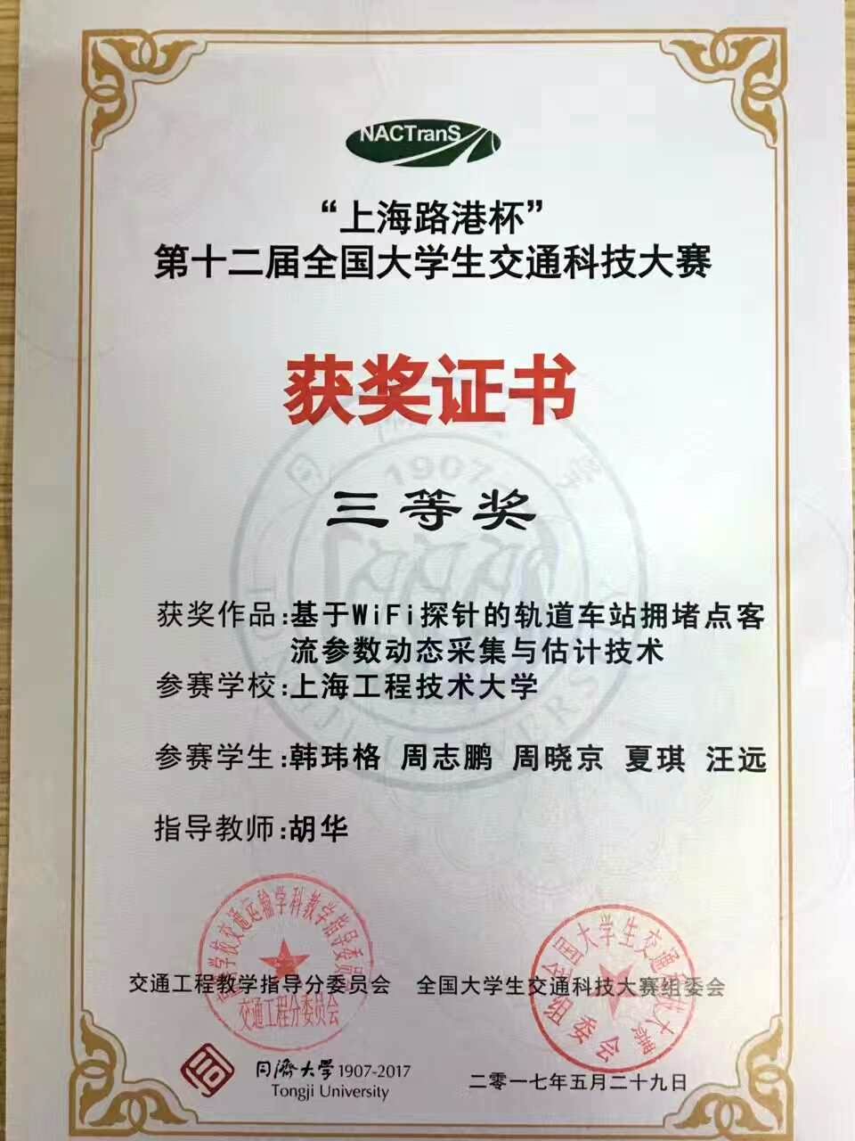 5月27日至29日,来自全国51所高校的500余师生共聚同济大学,参加“路港杯”第十二届全国大学生交通科技大赛决赛。我校城市轨道交通学院胡华副教授指导,由韩玮格、周志鹏、周晓京、夏琪、汪远5名同学制作的“基于WiFi探针的轨道车站拥堵点客流参数动态采集与估计技术”项目入围决赛并荣获全国三等奖。