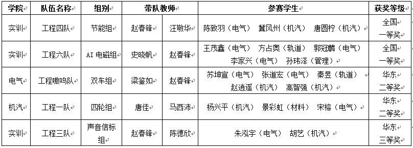 经过充分备战,各小组在紧张激烈的比赛中灵活应对突发状况,及时调整智能车模硬件故障和软件程序,发挥出了最佳状态。最终,工程实训中心赵春锋、汪敬华指导工程四队获得直立节能组全国一等奖,工程实训中心史晓帆、赵春锋指导的工程六队获得AI电磁组全国一等奖,电子电气工程学院梁鉴如与工程实训中心赵春锋指导的工程嗷呜队获得双车组华东赛区二等奖,机械与汽车工程学院唐佳与马西沛指导的工程一队获得四轮组华东赛区二等奖,工程实训中心赵春锋、陈德欣指导的工程三队获得声音信标组华东赛区三等奖。