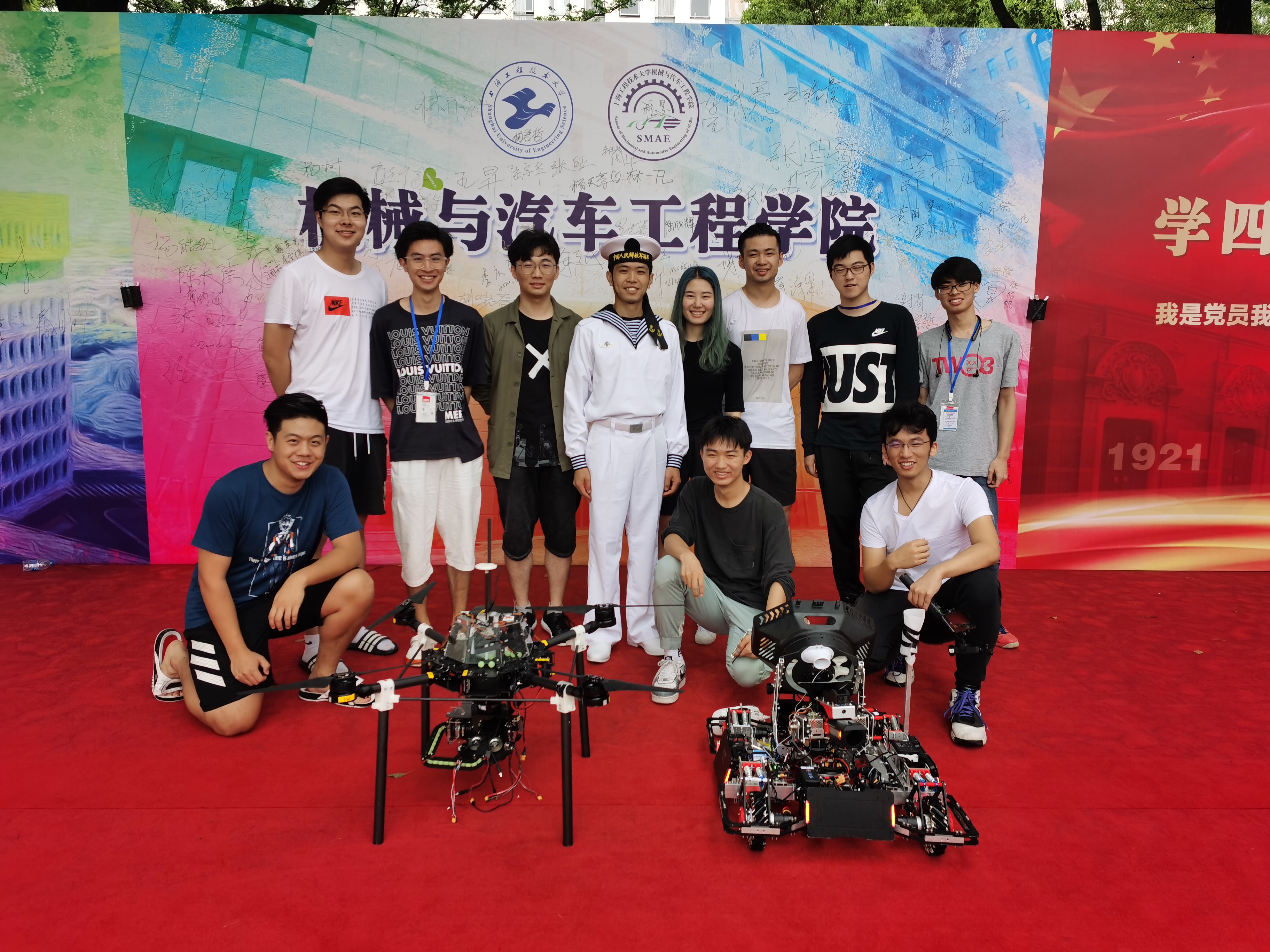 我校木鸢机甲战队于2019年10月组队,在机械与汽车工程学院学生科创中心机械创新基地张春燕、张力骅、杨光、唐佳、骆佼等老师的指导下,实现了从无到全阵容机器人的突破。在长达近一年的备赛过程中,战队共历经7次团体测评,即规则测评、赛季规划测评、中期形态视频测评、裁判系统测评、设计报告测评、飞手测评、完整形态测评,最后获得得国赛参赛资格。