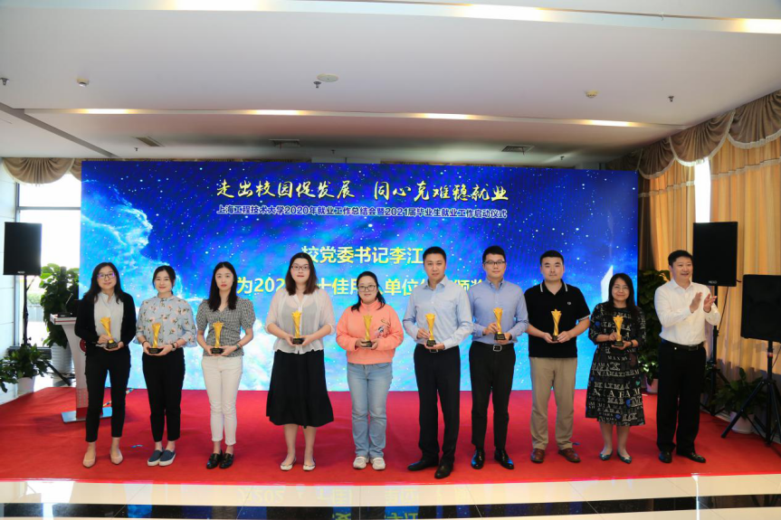 会上,校党委书记李江为长宁人社局、松江人社局和G60科创走廊联席办公室颁发了2020年学校就业工作特别贡献奖,为华虹集团上海华力公司、上海建工集团、上海电气集团、东方国际集团、东航技术有限公司、上海地铁维保公司等十佳用人单位颁奖。2020年,学校坚持党委统筹领导,将“促就业、保民生”作为首要政治责任,统筹各方力量和资源,共筑“就业共同体”,形成了全员发动、全员参与的就业一盘棋。在这场就业大考中,学校充分发挥党员师生的先锋模范作用,用行动践行使命担当,交出了令人满意的答卷,取得了较好的成绩。