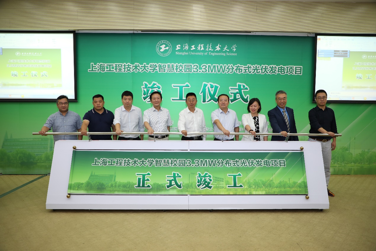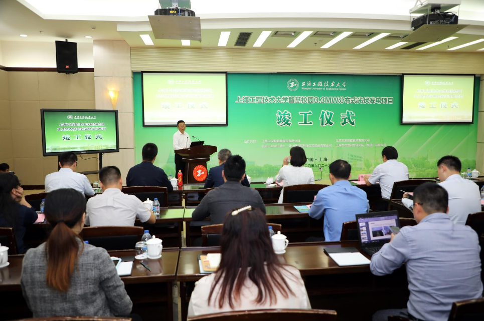 9月29日,上海工程技术大学智慧校园3.3MW分布式光伏发电项目竣工仪式在图文信息中心第三报告厅举行。姚秀平副校长与市教委后勤保卫处处长张旭、上海市能效中心主任王晋、市发改委能源处副处长沈维佳、市经信委经济运行处副处长肖明卫、学校后勤协会节能环保管理专业委员会卢志坚、松江区广富林街道办事处发展办公室主任陈宏祥、新疆金风科技股份有限公司副总裁潘彦田、上海工汉新能源科技有限公司总经理王鑫、上海电器科学研究所(集团)有限公司网络化集控事业部副总经理江浩、项目经理高阳、信息产业电子第十一设计研究院科技工程股份有限公司山东分院总经理邹其琦,以及兄弟院校后勤相关负责人和我校基建处、保卫处、后发中心负责人等参加了竣工仪式,仪式由后勤实业发展中心主任王佳杰主持。