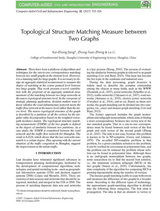 近日,我校数理与统计学院江开忠副教授等在国际著名期刊《Computer-Aided Civil a,nd Infrastructure Engineering》发表了题为“Topological Structure Matching Measure between Two Graphs(两图间的拓扑结构匹配度量)”的研究论文。