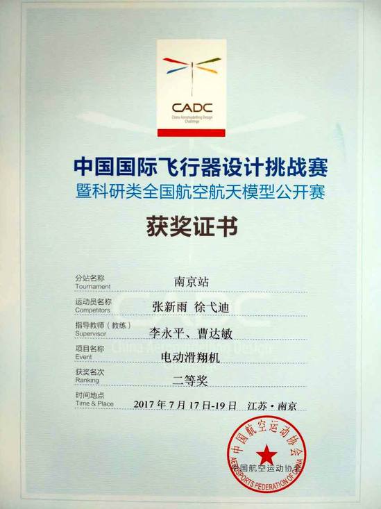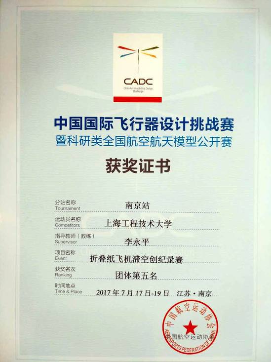 我校代表队经过激烈紧张的现场飞行竞赛,最终由航空运输学院、飞行学院李永平、曹达敏老师指导,张新雨、徐弋迪同学参加的电滑机组获得了电动滑翔机项目二等奖,汪洋、徐弋迪同学参加的双人小组赛获得了折叠纸飞机滞空创纪录赛团体第五名。