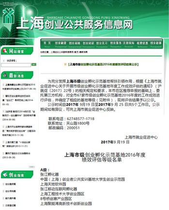 在刚结束的上海市级创业孵化基地年度工作成效评估工作中,根据上海市就业促进中心刚刚公示的《上海市级创业孵化示范基地2016年度绩效评估结果》,科技园获得上海市级创业孵化示范基地2016年度A级示范基地荣誉。
