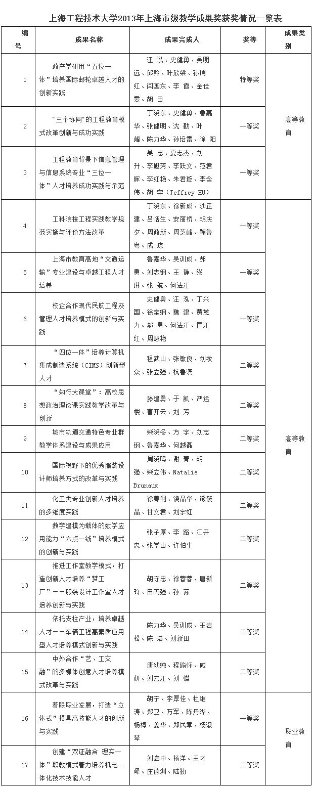 五年来,荣获国家级教学成果奖1项,上海市教学成果奖17项,其中特等奖1项、一等奖6项、二等奖10项。大学生在各类学科竞赛中获全国特等奖1项、一等奖25项、二等奖81项、三等奖43项。