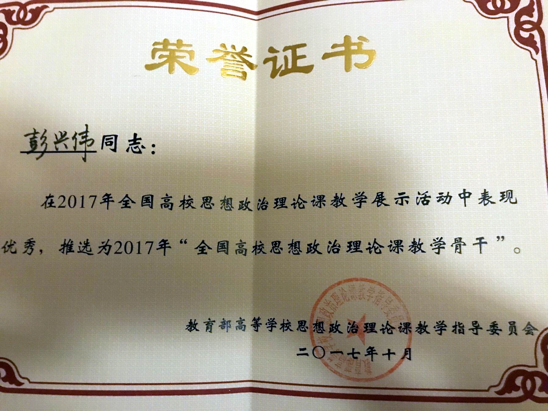 近日,马克思主义学院教师彭兴伟被教育部高等学校思想政治理论课教学指导委员会“马克思主义基本原理概论”分教指委推选为2017年“全国高校思想政治理论课教学骨干”。