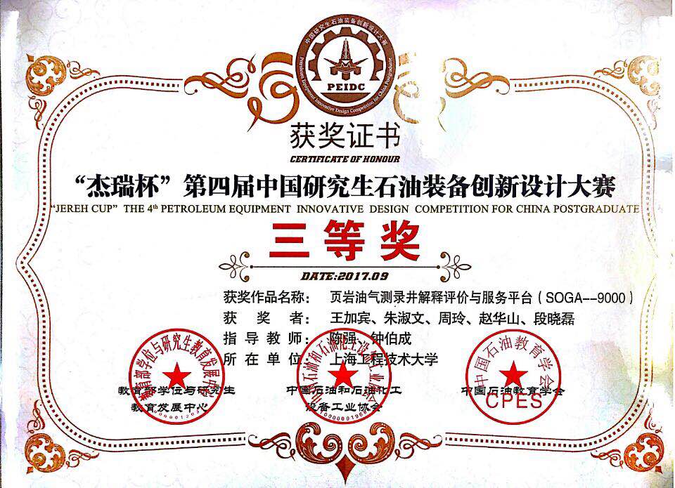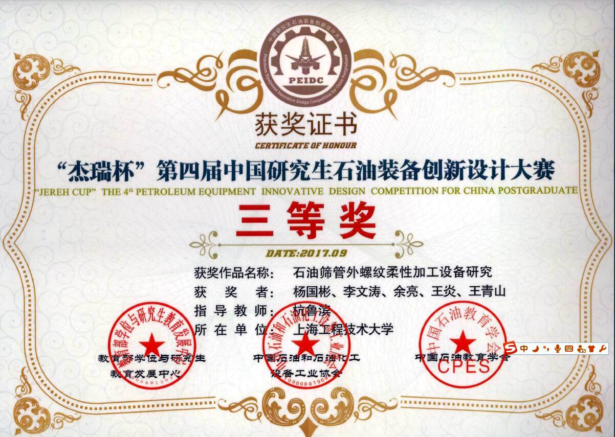 近日,由教育部学位与研究生教育发展中心、中国石油和石油化工设备工业协会、中国石油教育学会共同主办的第四届中国研究生石油装备创新设计大赛上,我校电子电气工程学院研究生王加宾、朱淑文、周玲、赵华山和段晓磊团队的作品《页岩油气测录井解释评价与服务平台(SOGA--9000)》(指导教师:陈强、钟伯成)和机械工程学院研究生杨国彬、李文涛、余亮、王炎、王青山团队的作品《石油筛管外螺纹柔性加工设备研究》(指导教师:杭鲁滨)表现出色,双双获得全国三等奖。