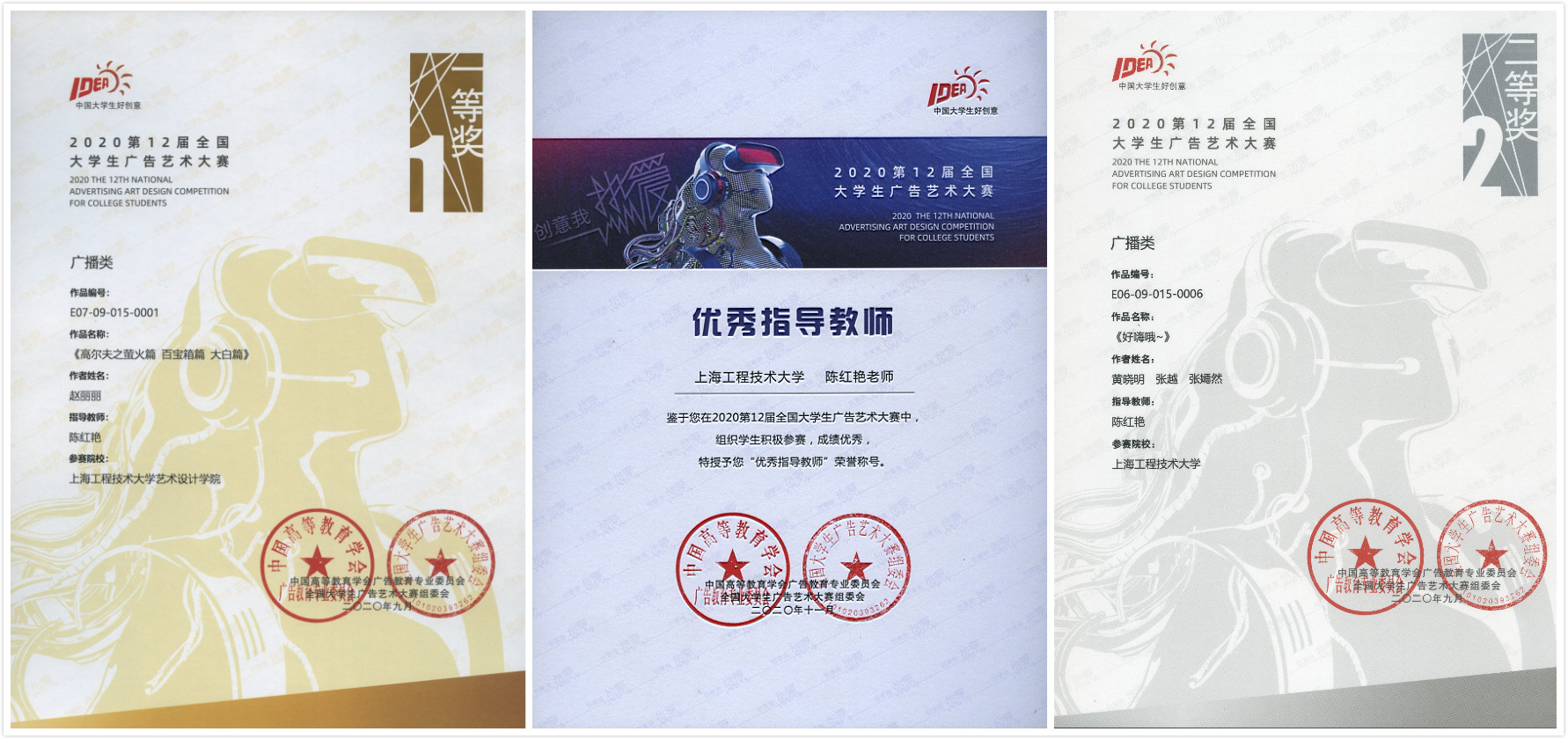 近日,在第12届全国大学生广告艺术大赛全国总赛区评选中,我校艺术设计学院喜获大丰收,广告学专业学生赵丽丽创作的系列广播广告《高尔夫之萤火篇 百宝箱篇 大白篇》喜获全国一等奖,黄晓明等同学创作的广播广告《好嗨哦~》获得全国二等奖,两则作品的指导老师陈红艳老师获得全国优秀指导教师奖,另有作品获全国优秀奖4项。