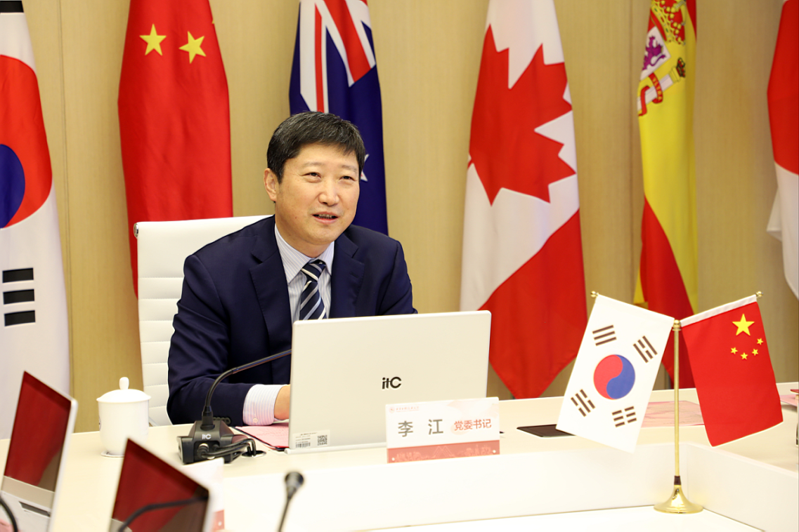李江书记对张济国校长和韩国东西大学的同仁表达了亲切的问候。他表示,在两校的共同努力下,双方合作办学项目在疫情中平稳有序地推进和发展,中韩合作办学项目学生就业率居全校第一,这离不开两校对合作办学项目的重视和付出。李江书记指出,目前两校最重要的工作就是申报国际创意设计学院,这对两校合作培养高素质艺术人才、实现高水平办学具有重要的意义,希望两校密切配合,继续做好后续申报工作。此外,李江书记邀请张济国校长疫情过后再次访问我校,见新老朋友,共话合作。