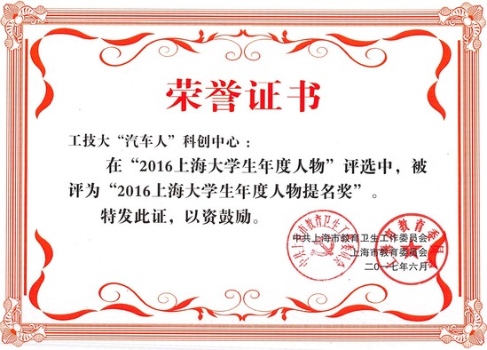 上海市教委近日公布了2016上海市大学生年度人物评选结果,我校汽车工程学院“汽车人”科创中心在众多高校中脱颖而出,获评“2016上海市大学生年度人物提名奖”。