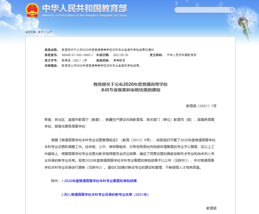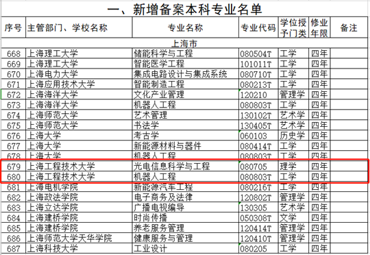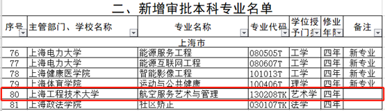 近日,教育部下发《教育部关于公布2020年度普通高等学校本科专业备案和审批结果的通知》(教高函〔2021〕1号),对2020年度普通高等学校本科专业备案和审批结果予以公布,我校光电信息科学与工程、机器人工程、航空服务艺术与管理3个本科专业获得教育部批准,其中航空服务艺术与管理是国家控制布点专业,也是目前上海市高校唯一的航空服务类本科专业。