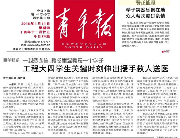 编者按:我校四位学子紧急救助患病学生化解危机的事迹引起了《青年报》的关注,1月11日,该报头版以及青年版以《工程大四学生关键时刻伸出援手救人送医》为题,介绍了我校学子救助患病学生的整个过程,将校园里的正能量传递到了千家万户。