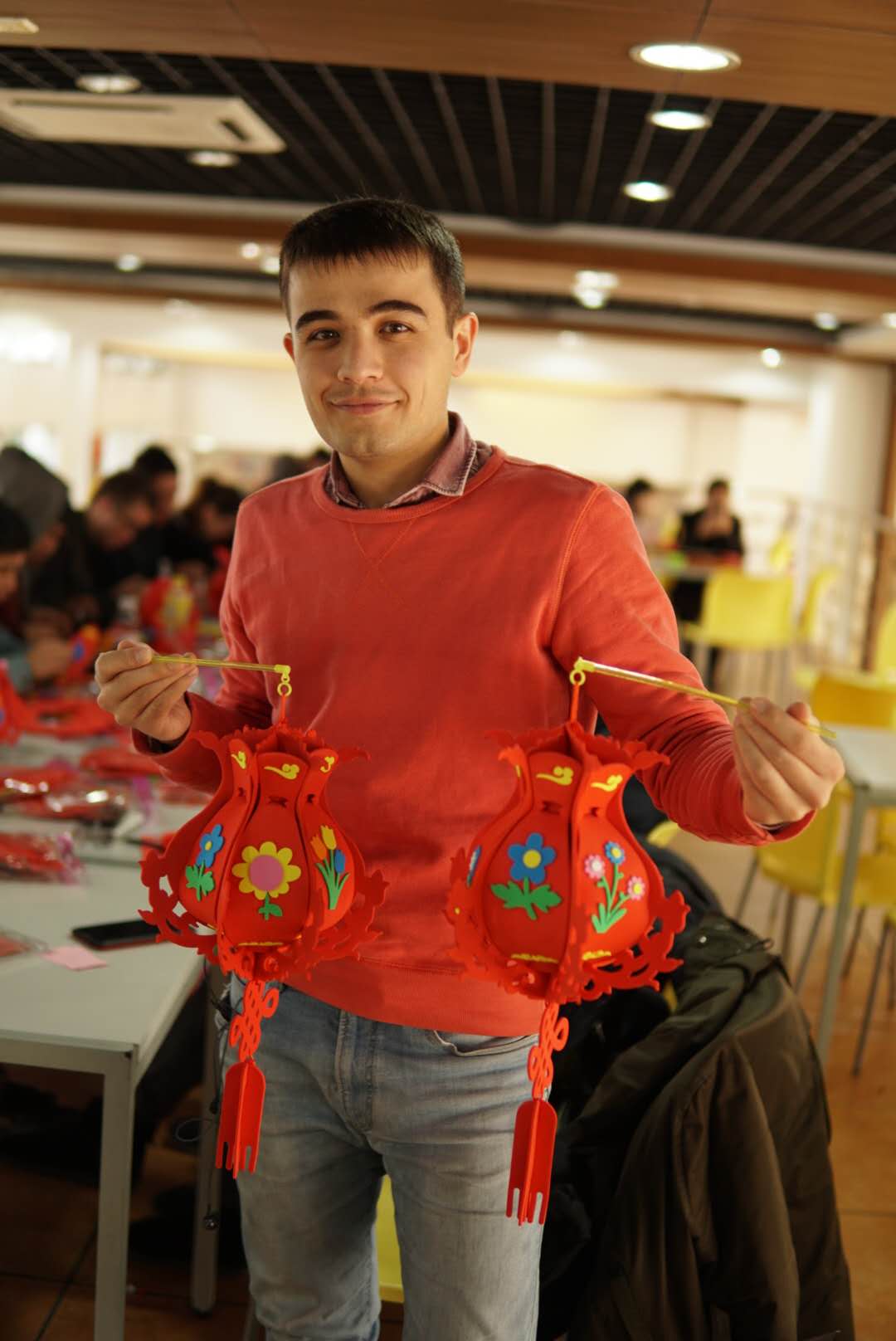国际交流处的老师向国际学生们简单介绍了中国人过春节的传统习俗,并指导大家一起动手制作起象征团圆意义的红灯笼:同学们兴致勃勃,认真研究,互相合作,剪裁,做挂钩、打流苏结,一一拼接在一起,调整灯笼的形状,不一会儿,一个个充满节日气息的作品就闪亮登场了,有五福款、鲜花款,小狗款…现场洋溢着喜悦的气氛。