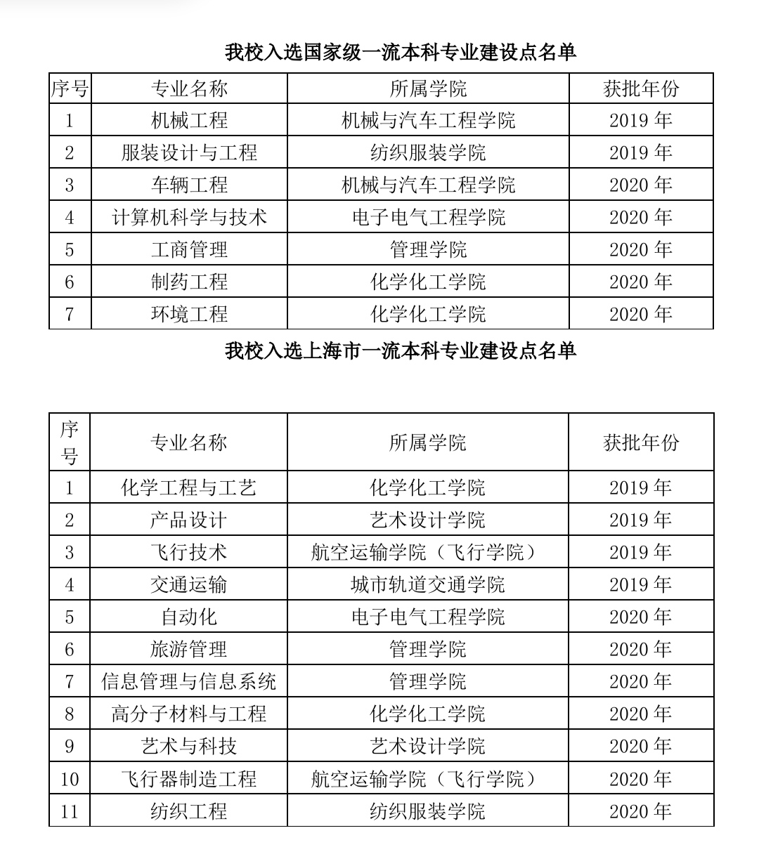 近日教育部印发《教育部办公厅关于公布2020年度国家级和省级一流本科专业建设点名单的通知》(教高厅函﹝2021﹞7号),我校车辆工程、计算机科学与技术、工商管理、制药工程、环境工程5个专业入选国家级一流本科专业建设点,自动化、旅游管理、信息管理与信息系统、高分子材料与工程、艺术与科技、飞行器制造工程、纺织工程7个专业入选上海市一流本科专业建设点。