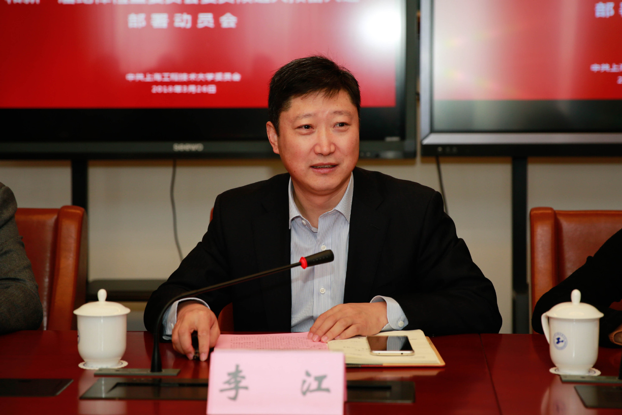 3月26日上午,学校在行政楼406召开提名推荐中国共产党上海工程技术大学新一届委员会和新一届纪律检查委员会委员候选人预备人选部署动员会。校党委书记李江,校党委副书记、副校长朱晓青出席会议,各基层党委、党总支、书记、副书记、组织员参加会议。会议由校党委副书记、副校长朱晓青主持。