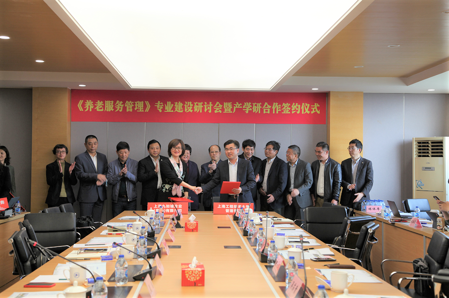 4月17日下午,我校在长宁校区举行《养老服务管理》专业建设研讨会暨产学研合作签约仪式。教育部工商管理类教学指导委员会副主任委员、中欧国际工商学院院长、上海工程技术大学社会保障问题研究中心主任汪泓教授,上海市老年基金会副理事长唐国才,上海市民政局二级巡视员、养老服务处处长陈跃斌,上海市人民政府发展研究中心社会文化处处长吴苏贵,上海市养老服务行业协会会长徐启华,长三角区域养老服务促进中心理事长冯建光以及上海人寿堂养老服务(集团)有限公司董事长冯强,上海九如城企业(集团)有限公司董事长谈义良,上海万宏工业投资(集团)有限公司总经理宿静,长江养老保险股份有限公司董事长苏罡,长宁区仙霞新村街道党工委书记高峥等出席研讨会。校党委副书记、工会主席史健勇教授致欢迎词,管理学院党委书记周洁主持会议,管理学院院长胡斌教授与产学研合作单位签约,教务处副处长金晓怡教授等参加研讨。
