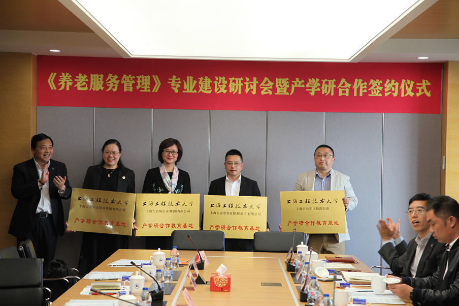 学校与上海人寿堂养老服务(集团)有限公司、上海九如城企业(集团)有限公司、上海万宏工业投资(集团)有限公司、仙霞街道全国智慧养老示范点等单位签署了养老服务管理本科专业产学研协议,并授予产学研合作教育基地铜牌。双方计划携手定向培养“养老规划师”,不仅满足了行业需求,也大大提升了职业形象和职业认同感,实现学生从大一至大四年级的“由进到出”的全周期产学研实践教育,实施校企“人才共育、效果共评”,着力提升学生的专业认知、理论素养、应用能力和就业竞争力,为企业和社会培育、输出优秀人才。