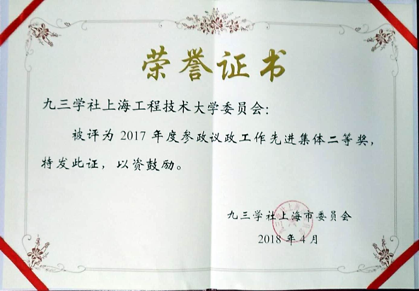 日前,九三学社上海市委员会举行“2017年度参政议政工作暨表彰会议”,九三工程大委员会荣获九三学社上海市委2017年度参政议政先进集体二等奖,我校宓一鸣副主委代表委员会上台领奖。