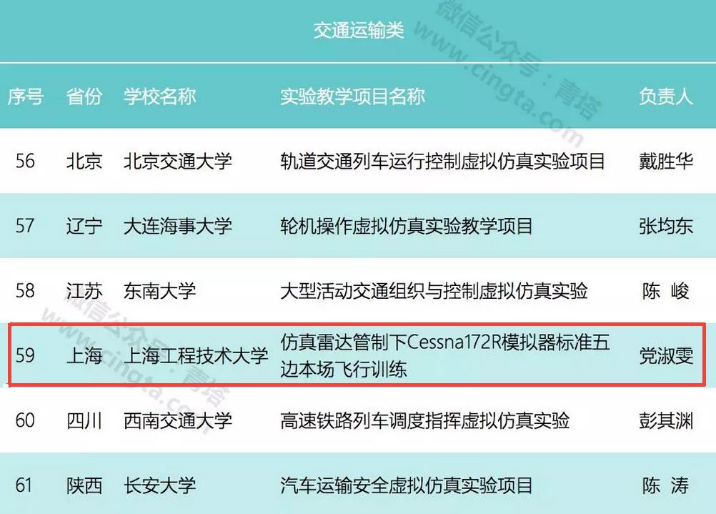 日前,教育部高等教育司公示了2017年度示范性虚拟仿真实验教学项目名单,航空运输学院/飞行学院党淑雯老师负责的《仿真雷达管制下Cessna172R模拟器标准五边本场飞行训练》被列入2017年国家级示范性虚拟仿真实验教学项目公示项目。本次共有91所高校的105个项目进入公示名单。
