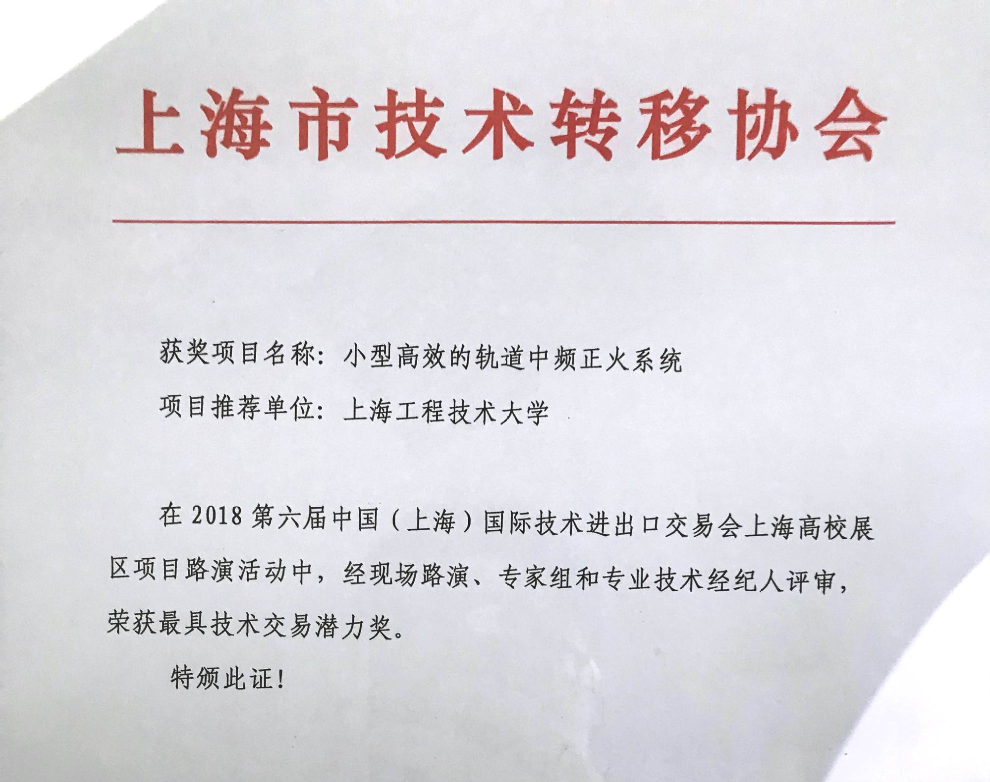 利用上交会平台,技术转移营销团队成员积极推介我校的科技成果。在钢轨无缝焊接中,钢轨连接部分的晶粒在高温下变大,影响连接部分金属的性能,必须通过二次加热来实现晶粒细化和碳化物分布均匀,以往采用“乙炔+氧气”的人工明火加热方式来实现,我校电子电气工程学院高飞老师带来的“钢轨焊接头中频正火智能控制装备”项目,采用电磁感应原理,在金属内部的涡流产生热量,使得钢轨焊接部分的温度控制在规定区域,从而实现钢轨接头部分的晶粒细化。该项目参加了上海高校展区项目路演活动,经过现场专家组和专业技术经纪人评审,在众多参加路演项目中脱颖而出,获得最具技术交易潜力奖。