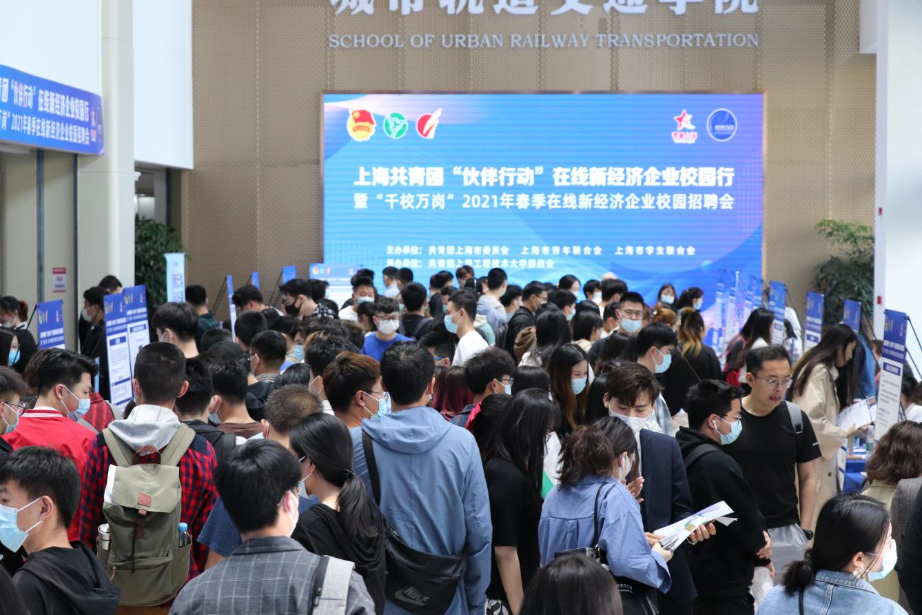 4月29日下午,由共青团上海市委员会、上海市青年联合会、上海市学生联合会共同主办的上海共青团“伙伴行动”在线新经济企业校园行暨“千校万岗”2021年春季在线新经济企业校园招聘会(4月专场)在我校现代交通工程中心举行。校党委副书记、校长俞涛,团市委副书记邬斌,团市委学校工作部部长任浡等出席活动。掌门教育、达达集团、得物APP、笑果文化等近六十家在线新经济企业拿出了1000余个优质就业岗位,上海交通大学、华东师范大学、华东理工大学、上海外国语大学、东华大学等18所本市西南片高校的1500余名应届毕业生到场应聘。