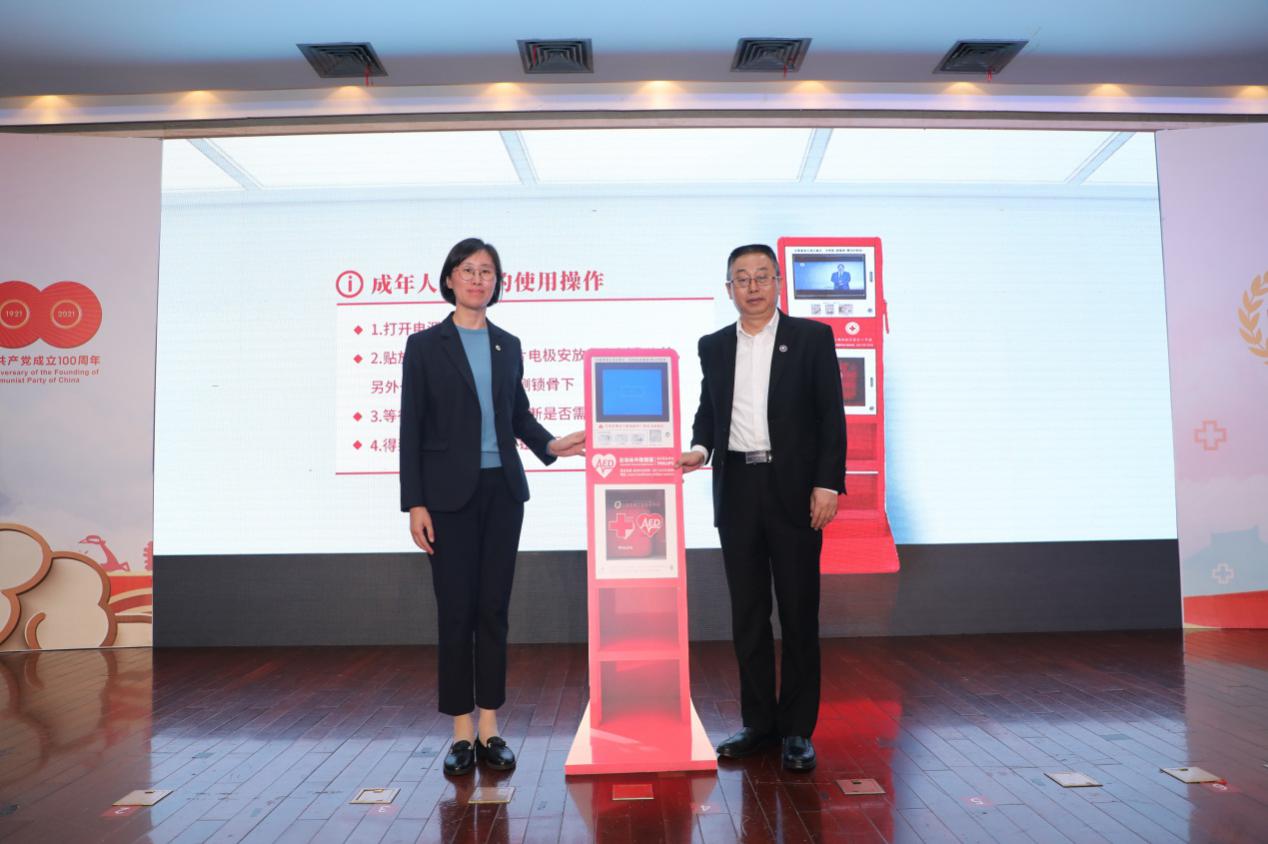 顾洁燕副区长代表区红十字会向我校捐赠一台AED(自动体外除颤器),姚秀平副校长接受捐赠。