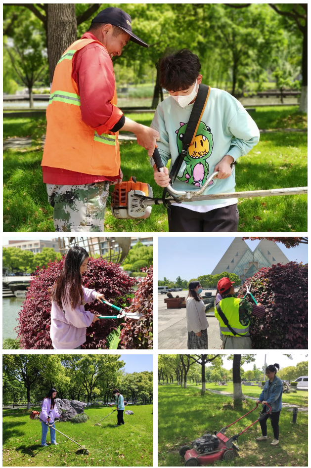 外国语学院朱毅捷、赵雯妍、张雅洁、吴佳雯等多名同学,在绿化师傅韩继东、徐群贺的指导下,手持草坪修剪机、修枝剪在骄阳下开始修整草坪、给树剪枝,平日在师傅手中看似轻松熟练的工作,到了自己手里却不简单,朱毅捷同学说:“看到绿化师傅布满老茧的双手,沉稳地拿着机器熟练地为我们示范,那一刻才感受到这份工作的艰辛,但当看到如诗如画般美丽的校园时,不禁真切感叹任何劳动都有技术含量!”