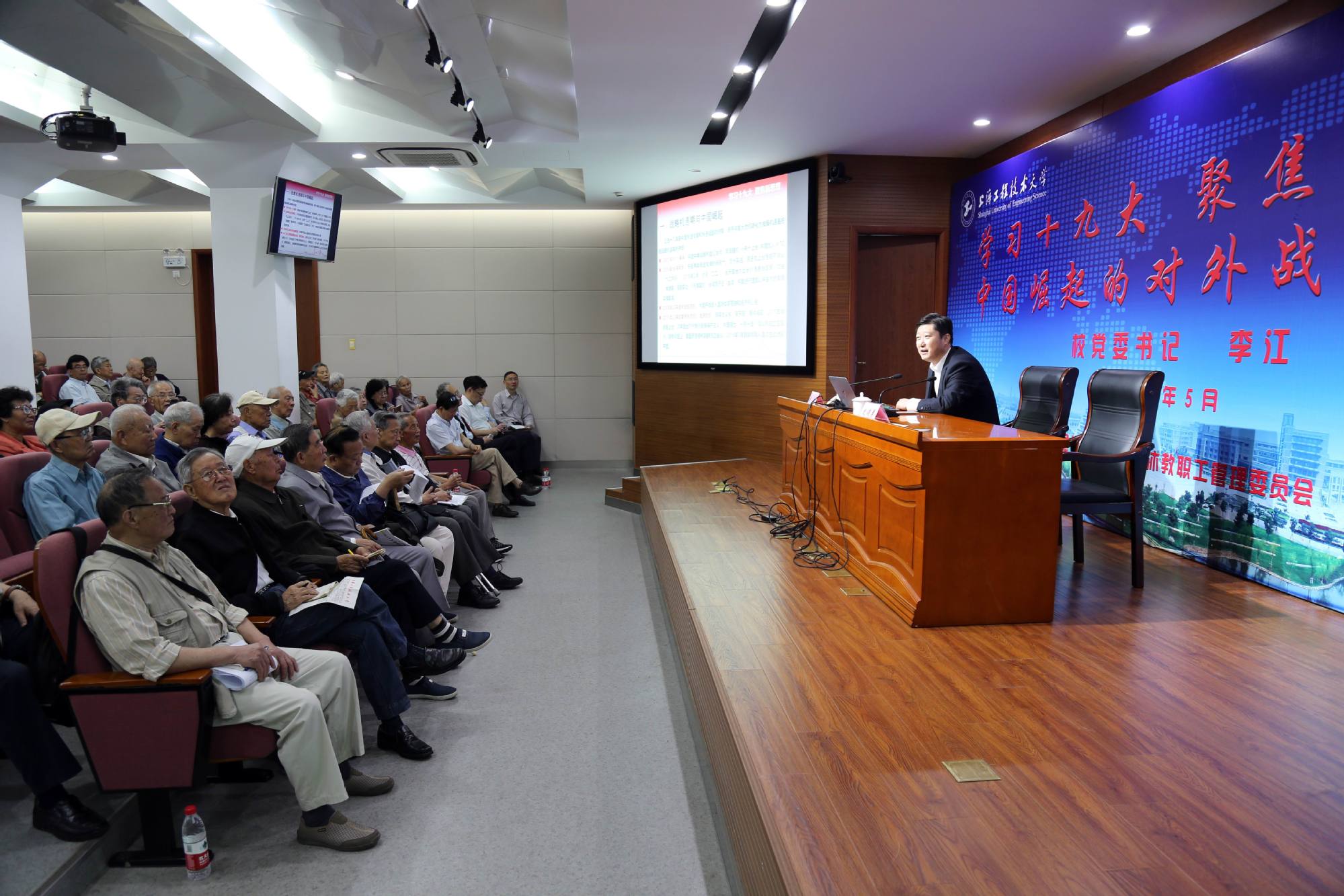 5月21日上午,学校在长宁校区报告厅举行了离退休教职工学习十九大精神专题辅导报告会,离休老干部、退休局级老领导、退休教职工共近200人出席报告会。校党委书记李江作了专题辅导报告,报告会由校党委副书记史健勇主持。