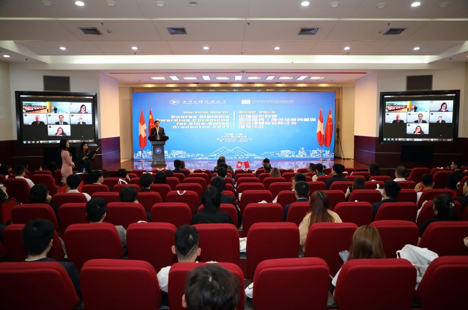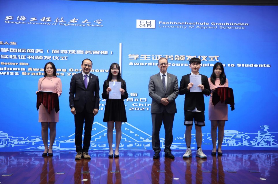 6月8日下午,中瑞合作办学项目国际商务(旅游及商务管理)专业2021届毕业生课程写实性证书颁发仪式在松江校区第二报告厅举行。瑞士驻上海总领事馆总领事曾礼惟先生,校长俞涛,副校长夏春明等出席仪式,瑞士格劳宾登应用科学大学校长Jürg Kessler、旅游学院院长Patric Arn等以视频会议形式参会。