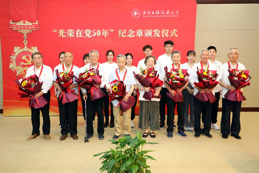 全体校领导与获颁“光荣在党50年”纪念章离退休党员代表合影。会上,青年学生朗诵《一生向党 初心如磐》、新入党党员合唱《祖国不会忘记》,向“光荣在党50年”的离退休党员致敬。