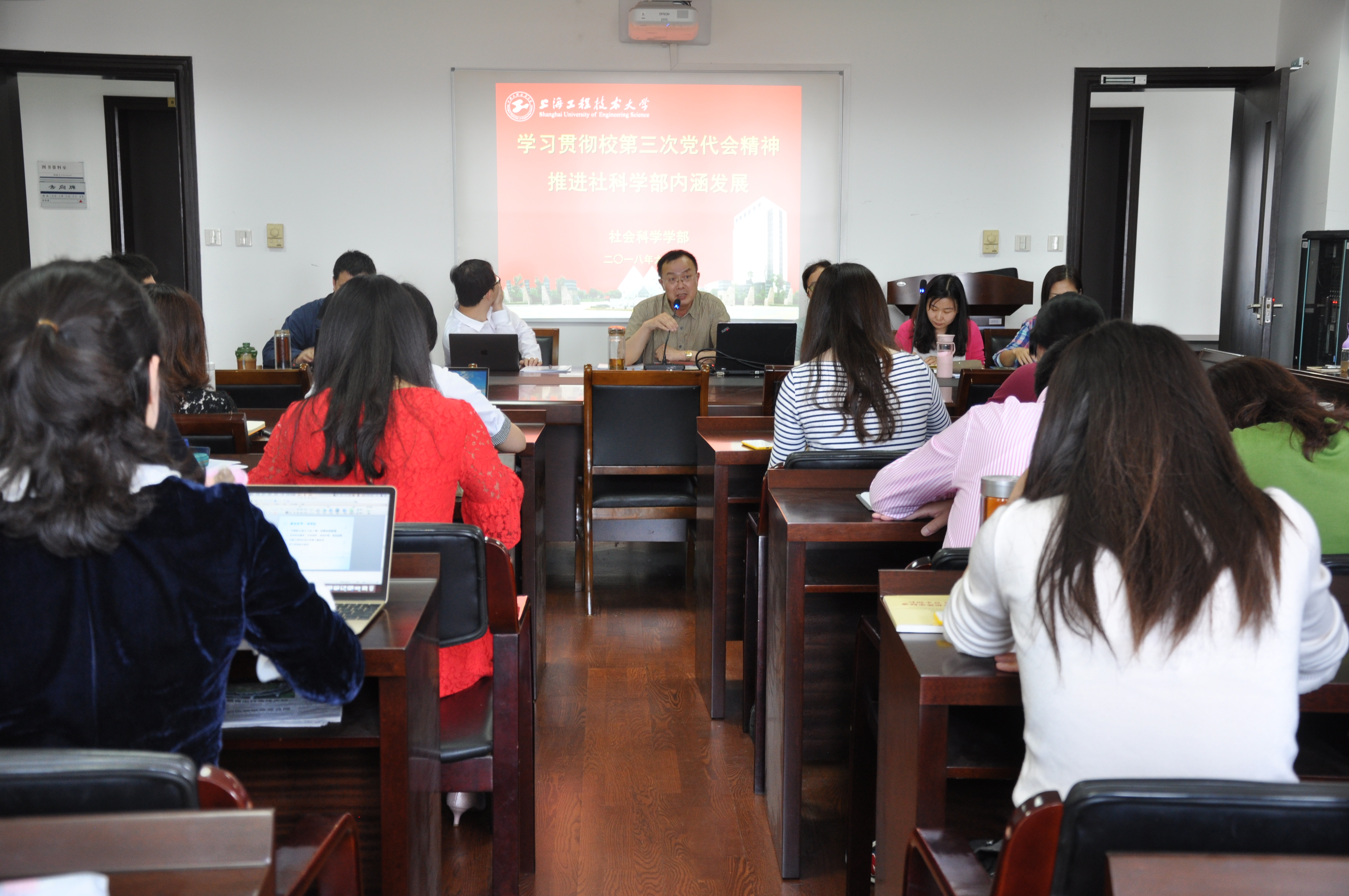 6月1日上午,社会科学学部党总支在行政楼812会议室召集学院教师代表集中学习了学校第三次党代会精神,社会科学学部党政领导和全体教师参加了此次学习会。学部党总支书记曹开云老师首先向各位教师党员传达了学校第三次党代会的会议精神,并带领大家共同学习了校党委书记李江同志作的题为《不忘初心,砥砺前行——为加快建成高水平现代化工程应用型特色大学而努力奋斗》的工作报告。曹书记指出,学校六年来取得了巨大的发展,此次党代会承前启后,对学校的发展有着重要的意义。他强调,我们社会科学学部要坚持学校“新三步走”奋斗目标、学校发展“三大战略”和八大重点任务等内容,学部要继续举全部之力,提升整体科研创新、管理和服务水平;要全面贯彻习近平新时代中国特色社会主义思想与十九大精神,落实上海市“课程思政”教学改革创新要求;要注重老师、学生的多方面学习发展,坚持国际化的办学特色拓宽师生的国际视野。随后,几位老师谈了自己的体会。公共管理党支部书记李晗表示,李江书记的报告鼓舞人心,我们要锐意进取,凝心聚力,认真完成教学科研和育人工作。学生党支部书记毕可影老师表示,学习了学校第三次党代会精神,我们用真心对待学生,帮助学生成长成才。通过专题学习,全体教师进一步理解了大会的主题,了解了学校改革建设发展取得的宝贵经验和成果,也准备把握了学校改革发展面临的形势和所处的历史方位,并明确了学校改革发展的总体目标及改革发展和建设任务。社会科学学部将以学校第三次党代会为契机,在学校党委的坚强领导下,齐心协力,顽强拼搏,团结带领全体师生为推动学校高水平、高质量的发展做出更大贡献。