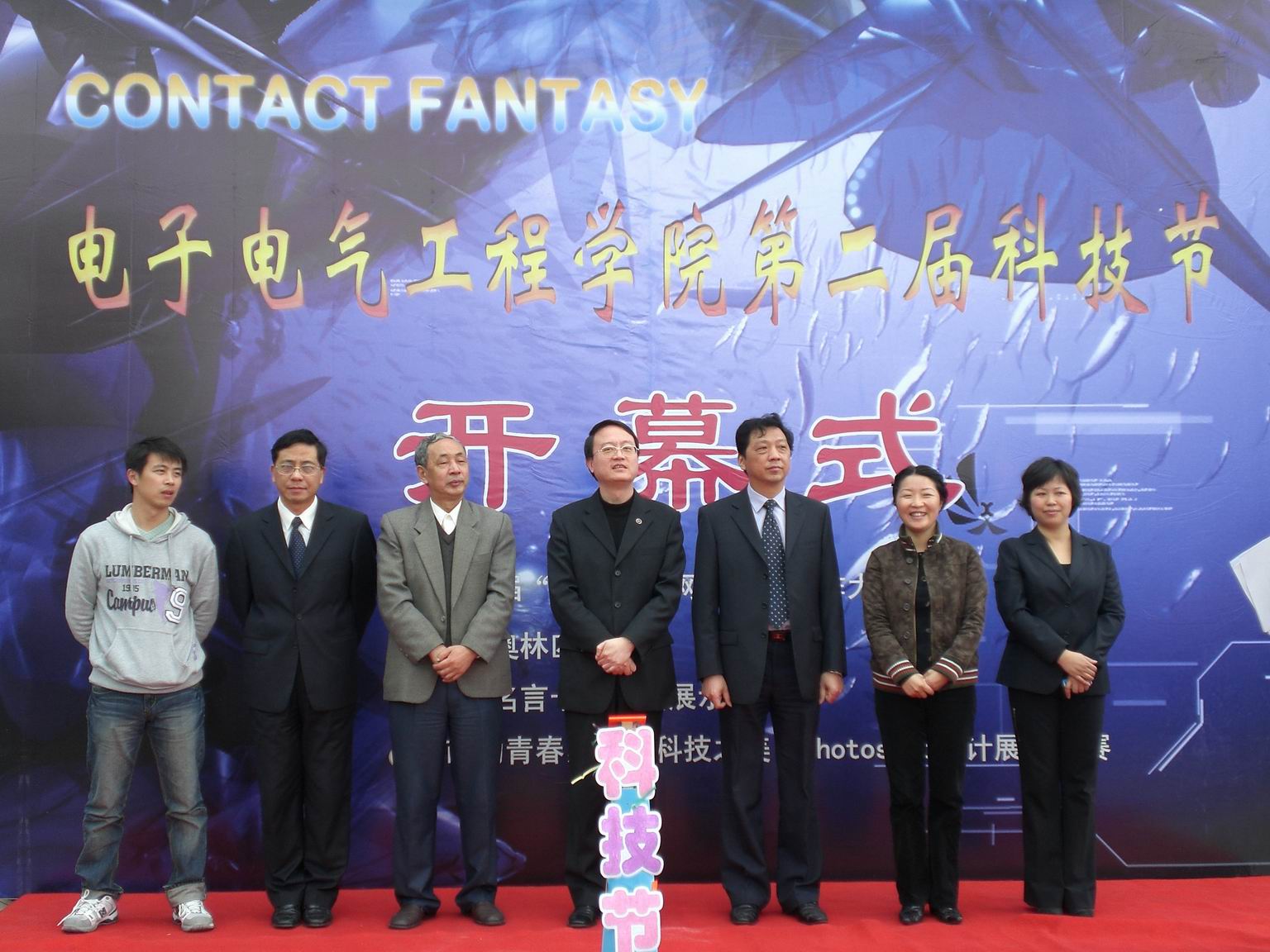 4月18日中午12:00,电子电气工程学院在校大食堂门口召开了第二届“Contact Fantasy”科技节开幕式,副校长孙培雷,校团委书记王一川以及电子电气工程学院党政领导、辅导员老师到场祝贺。