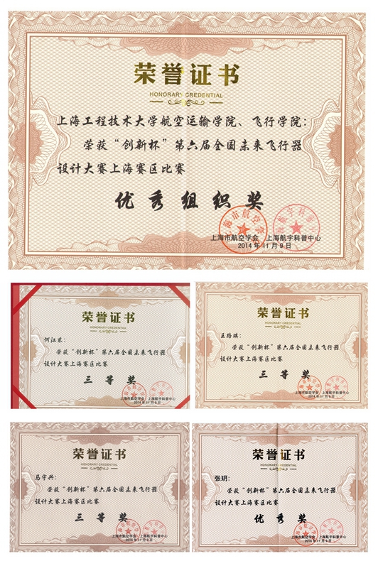 航空运输学院、飞行学院学生在学院教师的指导下,经过精心准备、层层选拔,最终5个作品在“创新杯”第六届全国未来飞行器设计大赛(上海赛区)上均获得了奖项,包括三等奖4名、优秀奖1名,同时,航空运输学院、飞行学院还获得了上海市航空学会颁发的优秀组织奖。