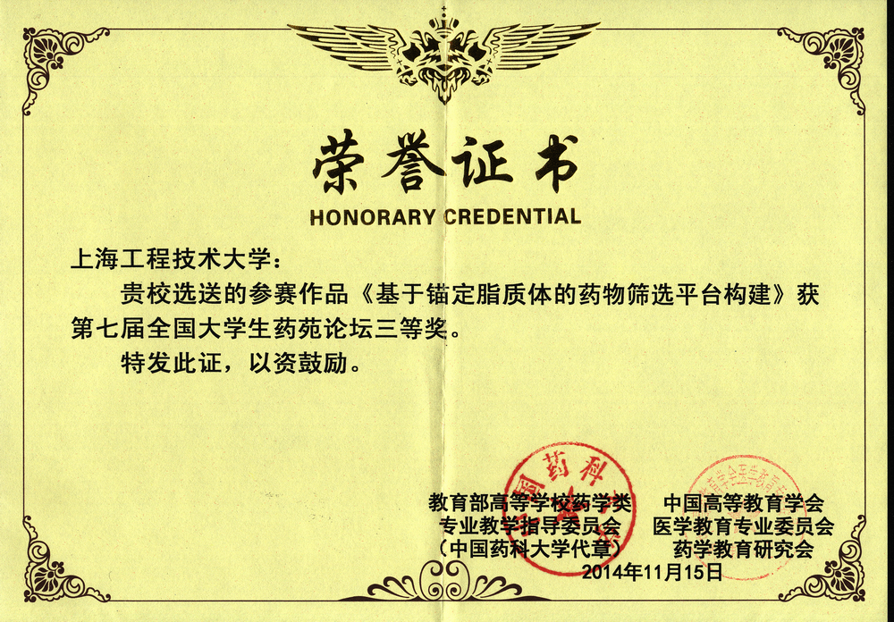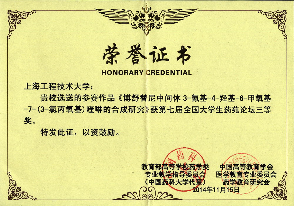 11月14日至16日,化学化工学院制药工程专业大三学生何海军(茆勇军老师指导,项目名称“博舒替尼中间体3-氰基-4-羟基-6-甲氧基-7-(3-氯丙氧基)喹啉的合成研究”)、张留洋(赵桃老师指导,项目名称“基于锚定脂质体的药物筛选平台构建”)参加了由教育部高等学校药学类专业教学指导委员会主办的“第七届全国大学生药苑论坛”,分别荣获三等奖,张留洋同学同时获得优秀论文奖。
