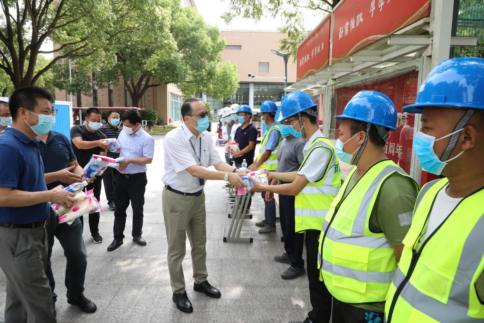 8月24日,史健勇副书记一行来到长宁校区,先后走访了保卫处门岗、国教学院、产教融合大楼项目施工现场、食堂、教学楼、科创楼等地,看望慰问坚守岗位的安保人员、后勤工作人员以及在岗工作人员。他关切询问暑期各项工作保障情况,对大家辛勤的工作表示感谢,并代表学校向大家送上诚挚问候。
