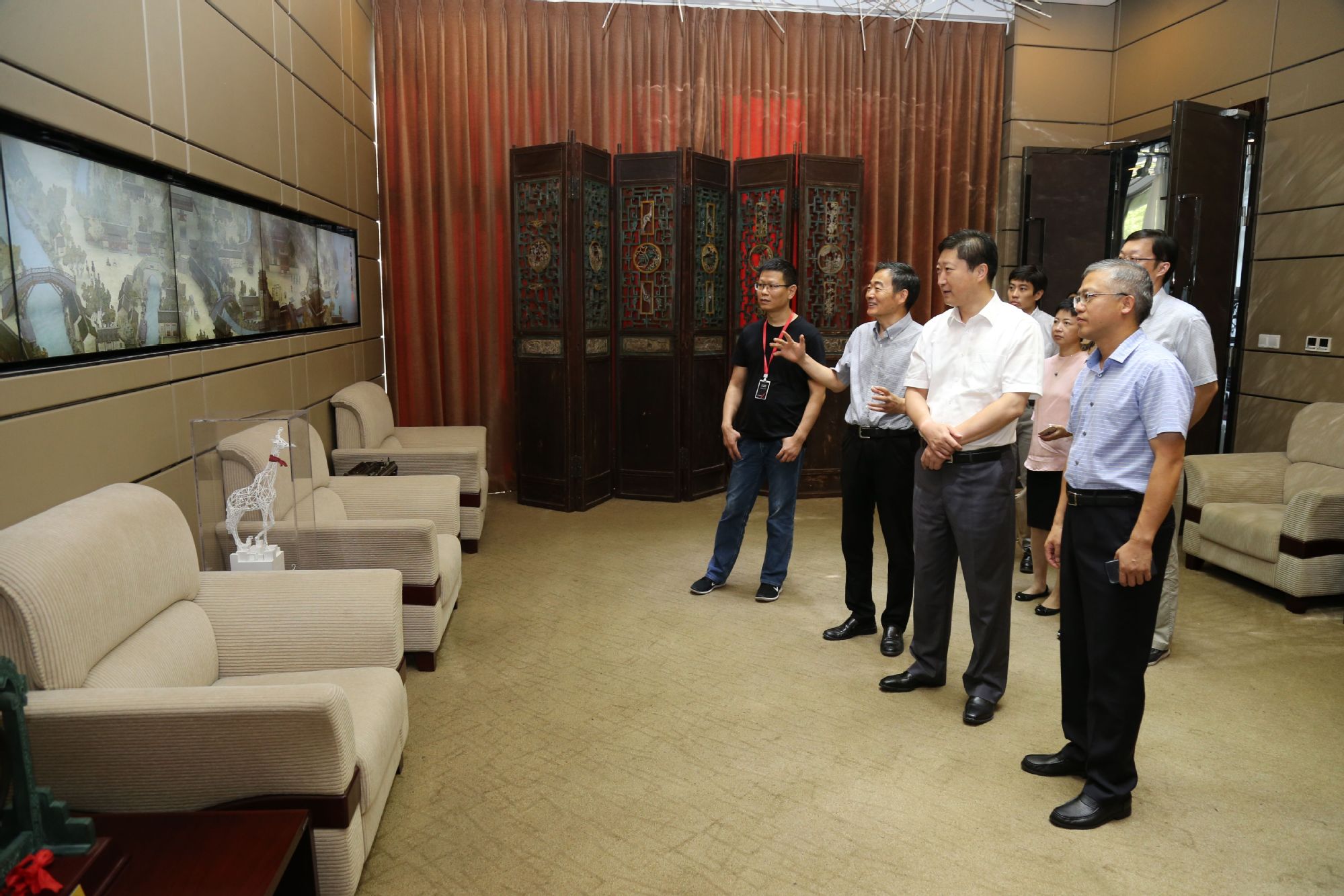 在艺术设计学院的产学合作教育单位上海风语筑展示股份有限公司,副总裁黄飞带队陪同李江书记一行参观风语筑公司陈列室,介绍了公司管理理念和行业先进技术,展示了公司案例。
