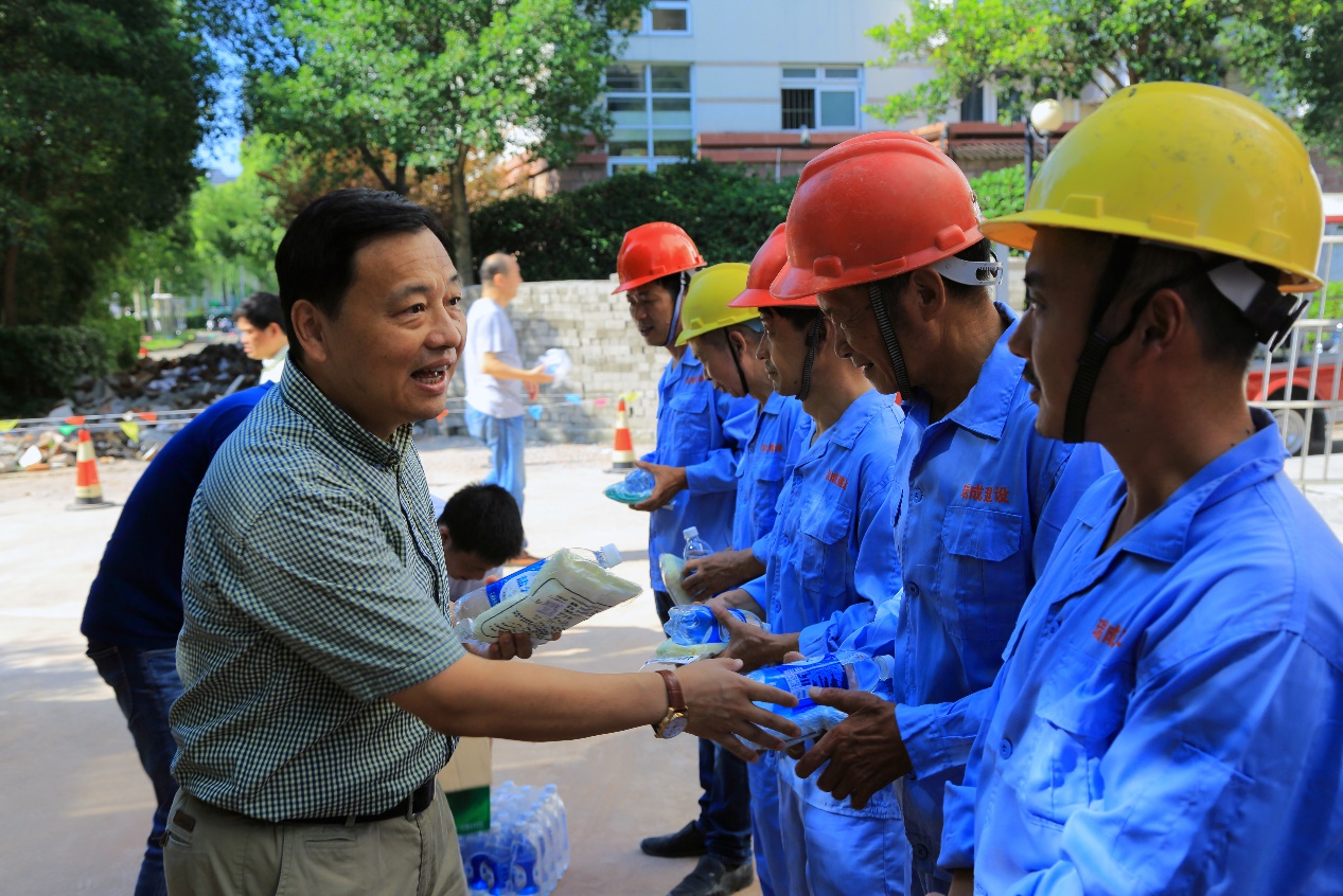 校党委副书记、副校长史健勇在基建处领导的陪同下,先后来到行政楼、松江校区二期工程C03标段施工工地、松江校区学生公寓修缮项目施工工地亲切慰问暑期冒着高温坚守在施工现场的一线施工工人,并送去防暑降温用品。