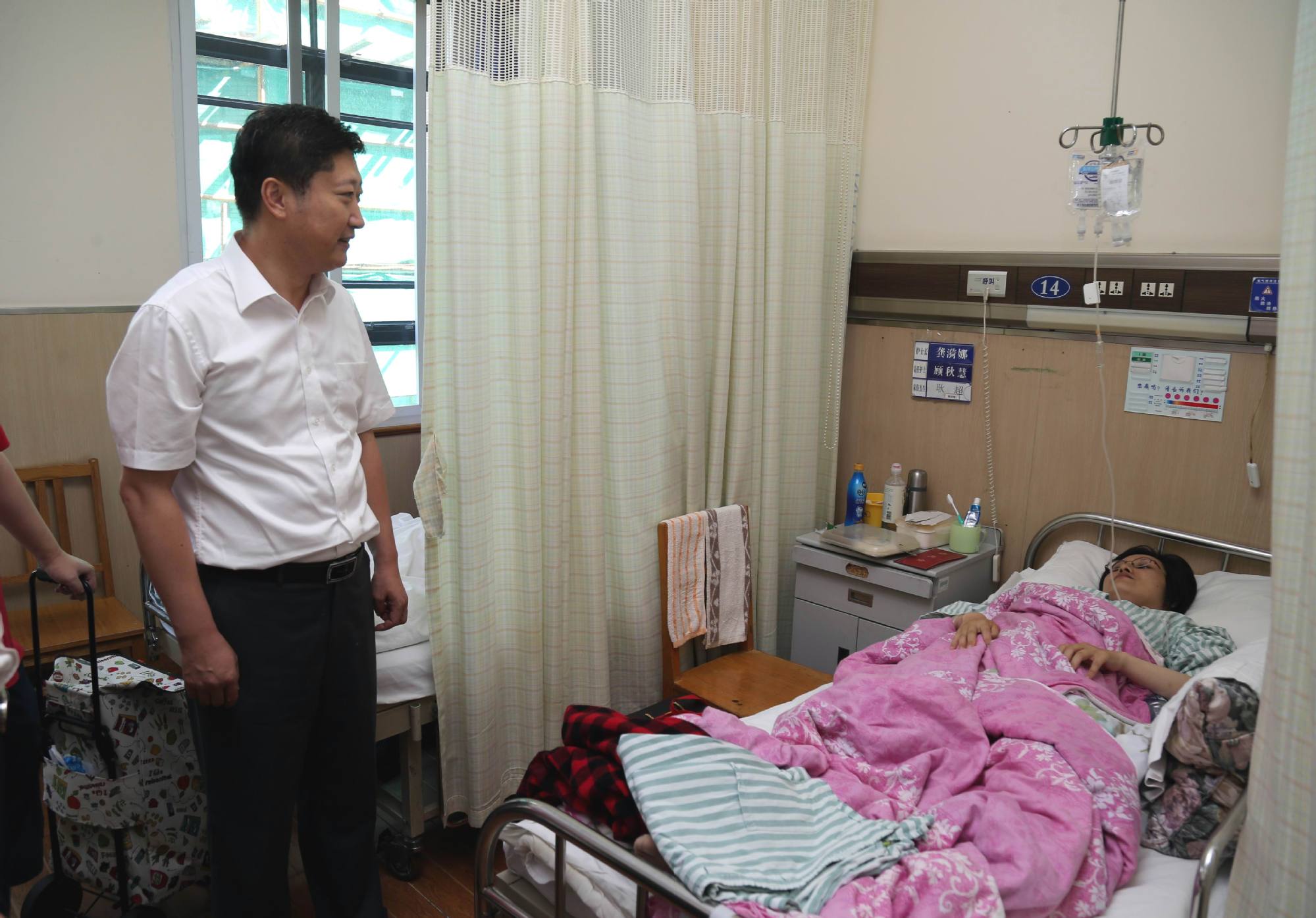 李江书记在校工会领导的陪同下,来到中山医院西院区看望患病教职工,送上了营养品和慰问金。李江书记详细询问了患病老师的病情和治疗情况,鼓励患病老师调整好心态,积极配合医院做好治疗工作,叮嘱家属精心照料,争取早日康复。患病老师和家属对学校的关心深表感谢。