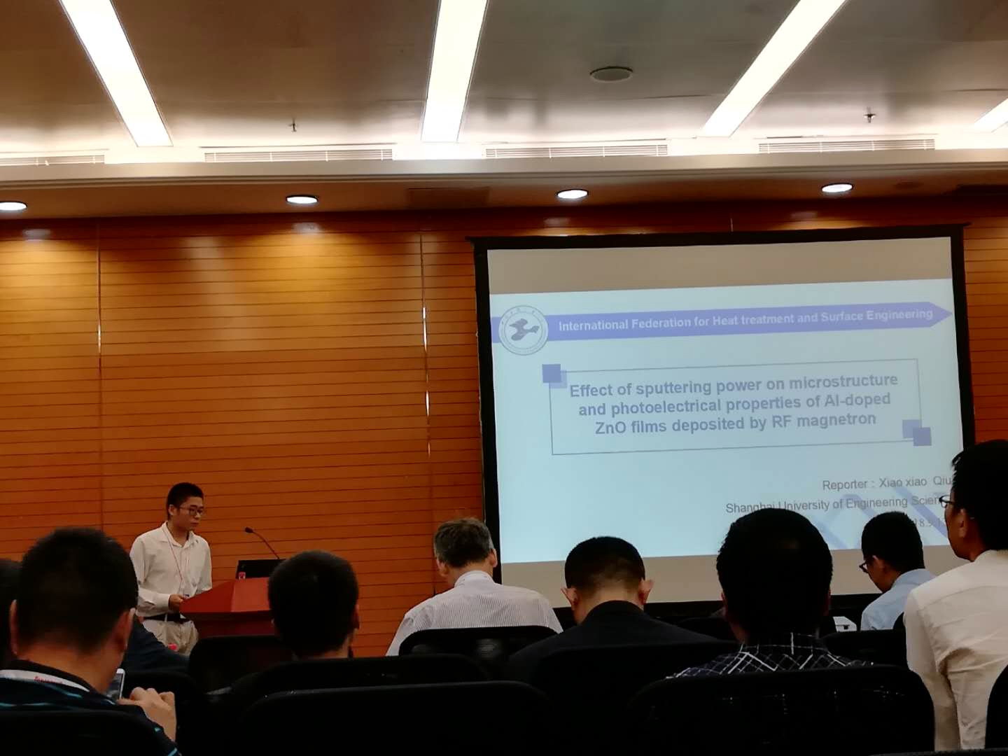 参会期间,邱小小就“Effect of sputtering power on microstructure and photoelectrical properties of Al-doped ZnO films deposited by RF magnetron sputtering”课题展开了论述。邱小小针对所研究的课题,开门见山介绍了课题的研究背景,即透明导电薄膜(TCO)大好形势下所面临的瓶颈,从而引出研究课题的方向——Al掺杂ZnO透明导电薄膜(AZO)的溅射功率对其光电性能的影响,接着阐述了课题的3个研究目的,然后对薄膜制备和性能检测两个主要的实验过程进行讲解,最后对晶体结构、表面形貌、电学性能、光学性能四个方面的结果进行了展示并深入分析。他的发言引起了与会专家学者的浓厚兴趣。同他一同前往的研究生郝艳也对自己的研究课题“Investigation of multiple fillers on the friction and wear behavior of epoxy composite coatings”与大家进行了交流与分享,其课题以复合涂层的减摩耐磨性能为目的,采用硬质粒子填充,同时发挥填料协同作用,从而提高摩擦磨损性能。
