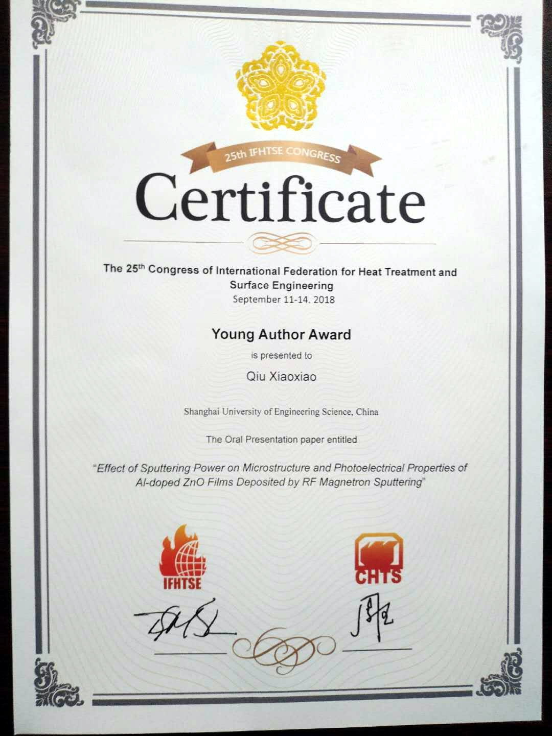 近日,第25届国际热处理及表面工程联合会大会在西安举行。我校材料工程学院的研究生邱小小参加大会并荣获青年学者奖。
