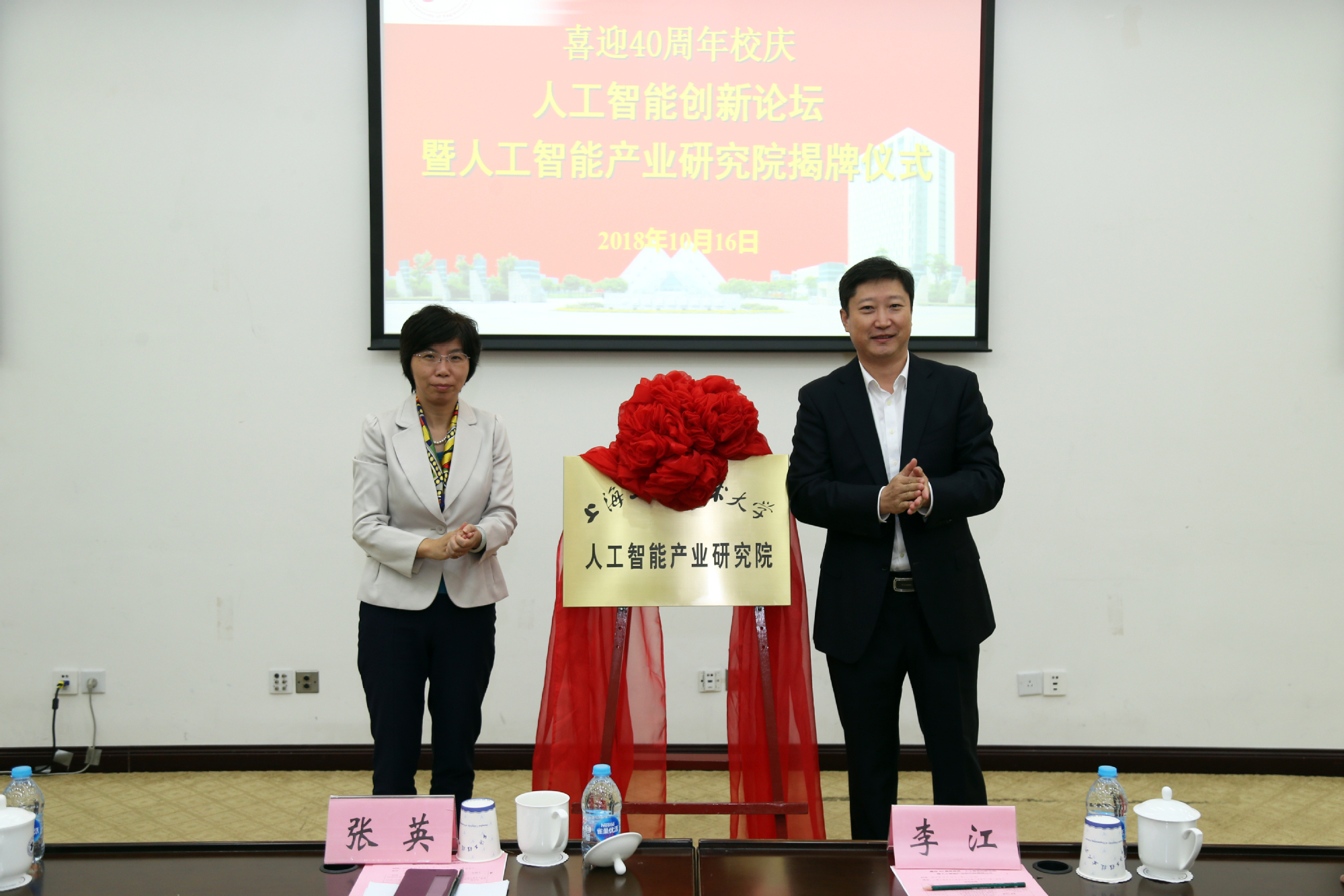 仪式上,上海工程技术大学党委书记李江与上海市经信委总工程师张英为“人工智能产业研究院”揭牌。