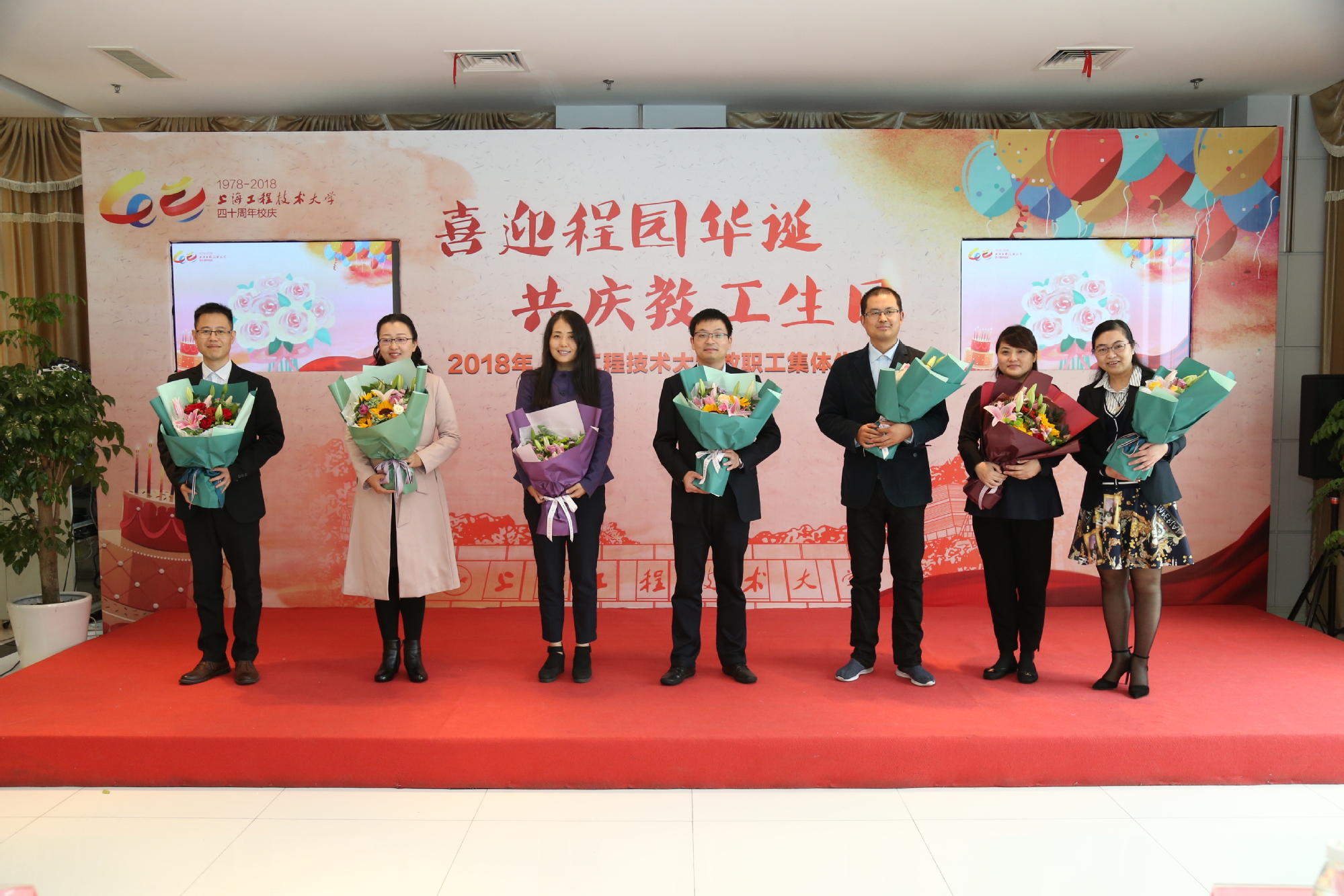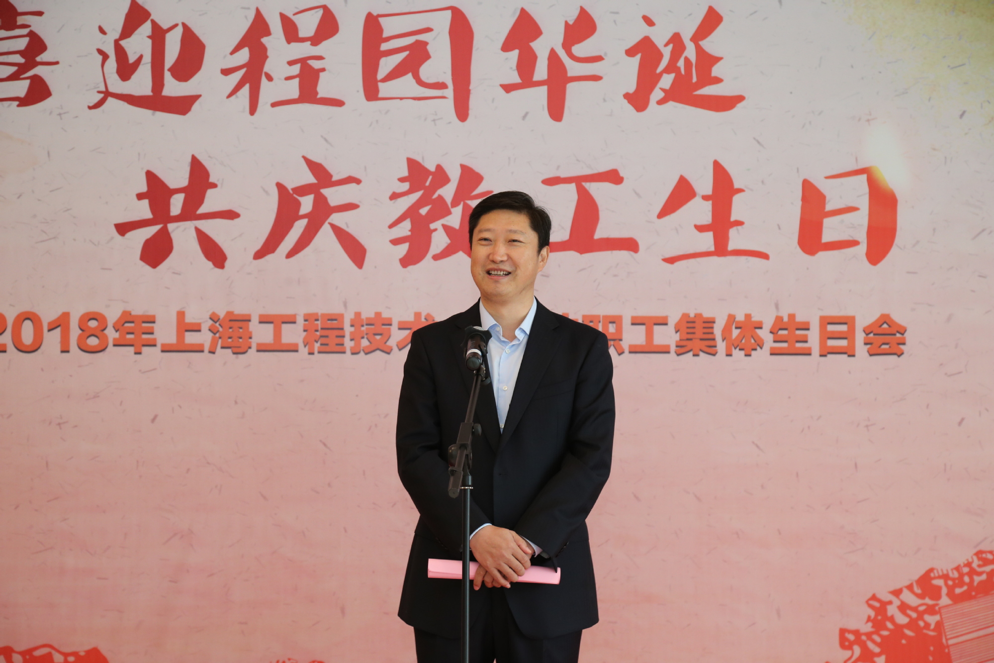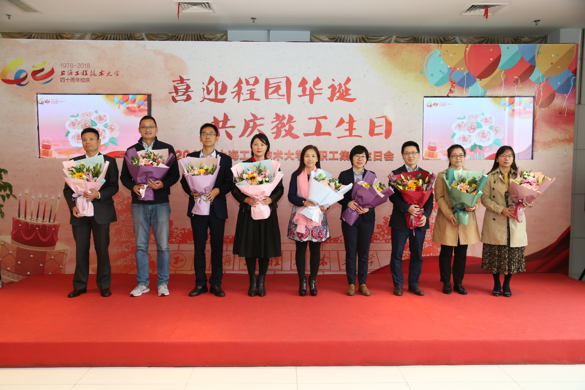 1022日下午,由校工会主办、数理统计学院、外国语学院承办的“喜迎程园华诞•共庆教工生日”2018年上海工程技术大学教职工集体生日会在行政楼19楼温情举行。校党委书记李江、校党委副书记、工会主席史健勇,各部门教职工代表及逢四十和与校庆同周生日教职工代表、党办、校办、组织部、宣传部、校庆办、人事处、学生处、团委、工会负责人、部分院处负责人、各部门工会主席参加了生日会。