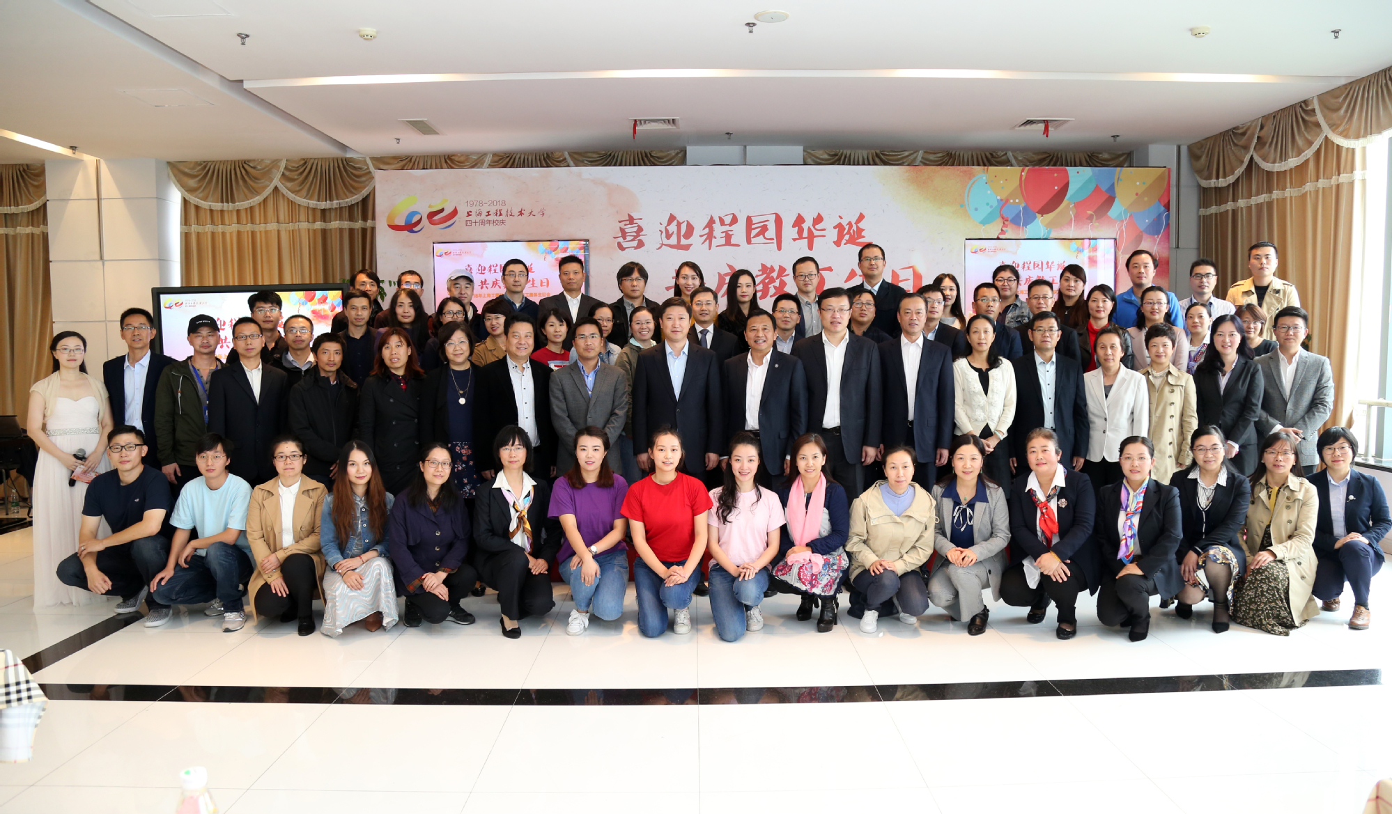 由工会自编自导的短片《“程”迹》带领大家简要回顾了工程大40年来的发展“足迹”,通过教师行走工程大的所见所闻,展现学校发展的新阶段、新面貌、新气象。随后,学生志愿者将手中的鲜花与心中的祝福献给了逢四十周岁教职工代表及校庆同周生日教职工代表。伴随着《祝你生日快乐》歌曲的旋律,印有“喜迎程园华诞•共庆教工生日”字样的三层蛋糕被缓缓推上台前,校党委书记李江、校党委副书记、工会主席史健勇与老师们一起许愿,集体切蛋糕环节将整个生日会推向高潮。