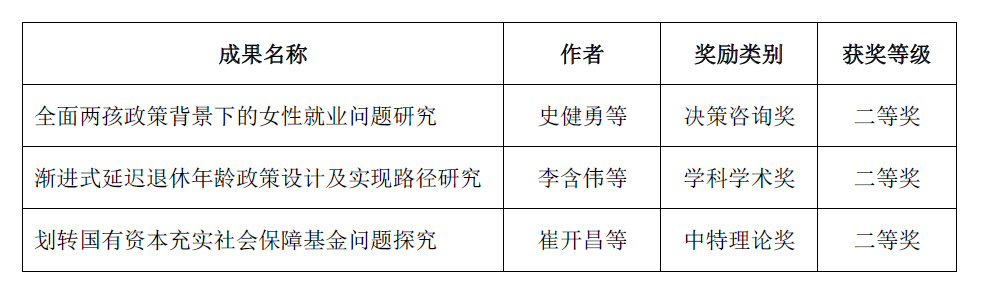我校3项获奖成果中,包括中国特色社会主义理论奖、学科学术奖、决策咨询奖各1项,均为二等奖。彰显了我校社会保障等学科的传统优势,也体现了我校近年来在智库建设方面取得的显著成绩。