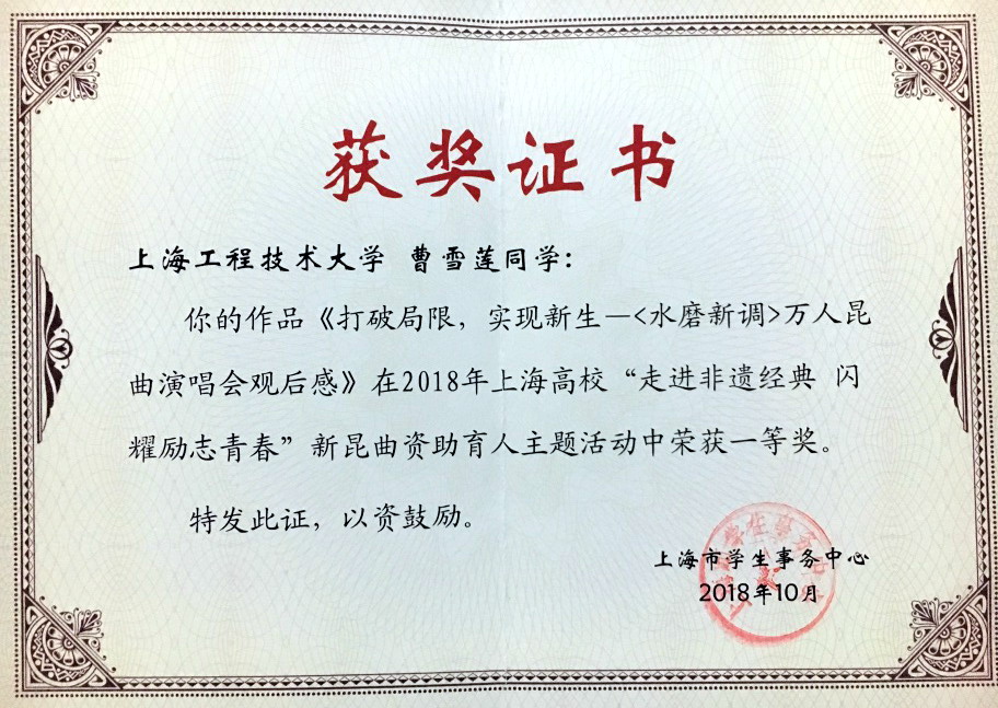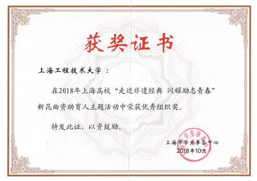 1125日,上海市学生事务中心公布了2018年上海高校“走进非遗经典 闪耀励志青春”新昆曲资助育人主题活动获奖名单。外国语学院本科生曹雪莲、机械与汽车工程学院本科生武建龙分获一、二等奖,我校荣获“优秀组织奖”。