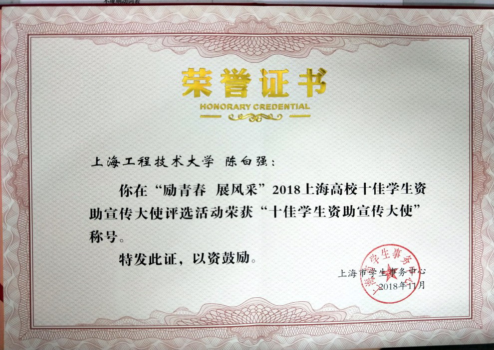 陈白强同学荣获上海高校“十佳学生资助宣传大使”称号