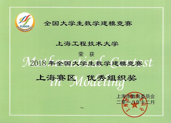 12月21日,2018高教社杯全国大学生数学建模竞赛上海赛区颁奖大会在华东师范大学举行。我校共有35组队伍获奖,其中获得全国二等奖4项,上海市一等奖4项,上海市二等奖13项,上海市三等奖14项,获奖数在市属高校中排名第一。同时我校还获上海市优秀组织奖,指导教师游晓明教授获优秀指导教师。