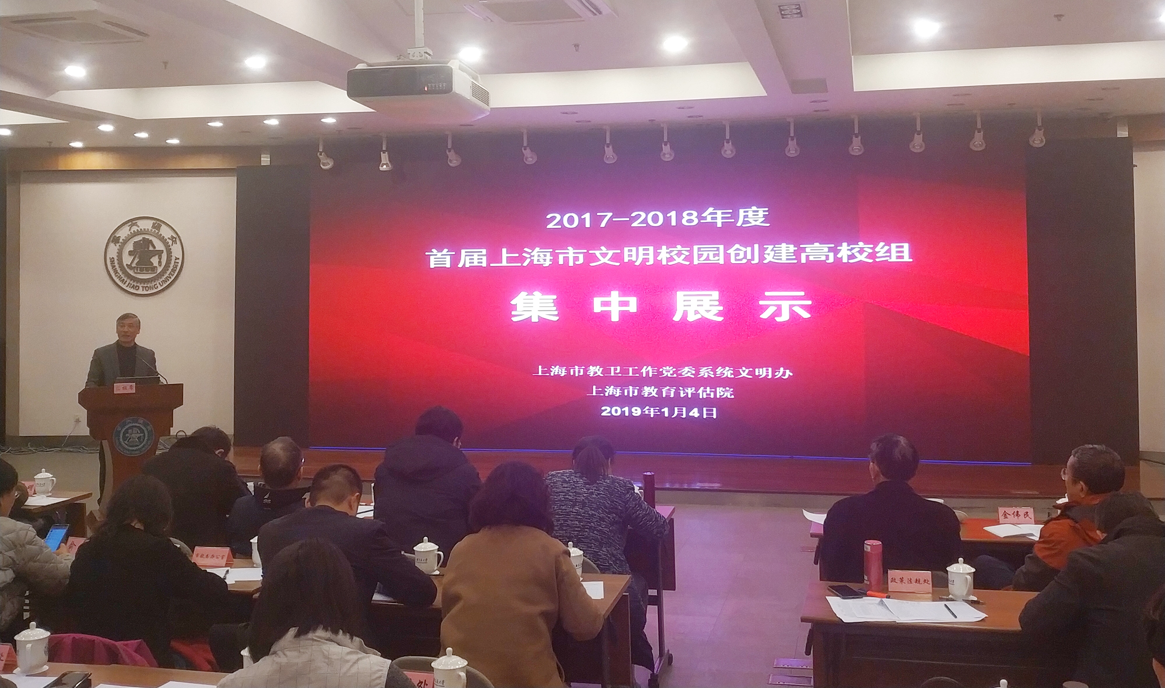1月4日,在上海交通大学徐汇校区,市教卫工作党委系统文明办组织召开2017-2018年上海市文明校园创建终期考评集中展示会,来自全市50所高校参加集中展示汇报。党委副书记鲁嘉华代表我校作文明创建工作汇报。