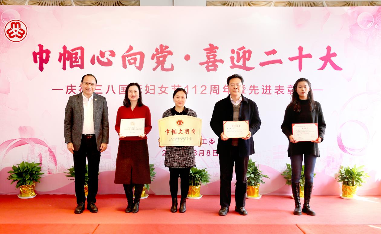 校党委副书记、副校长、妇工委主任朱晓青宣读了表彰名单并为2021年度上海工程技术大学巾帼建功标兵颁奖。