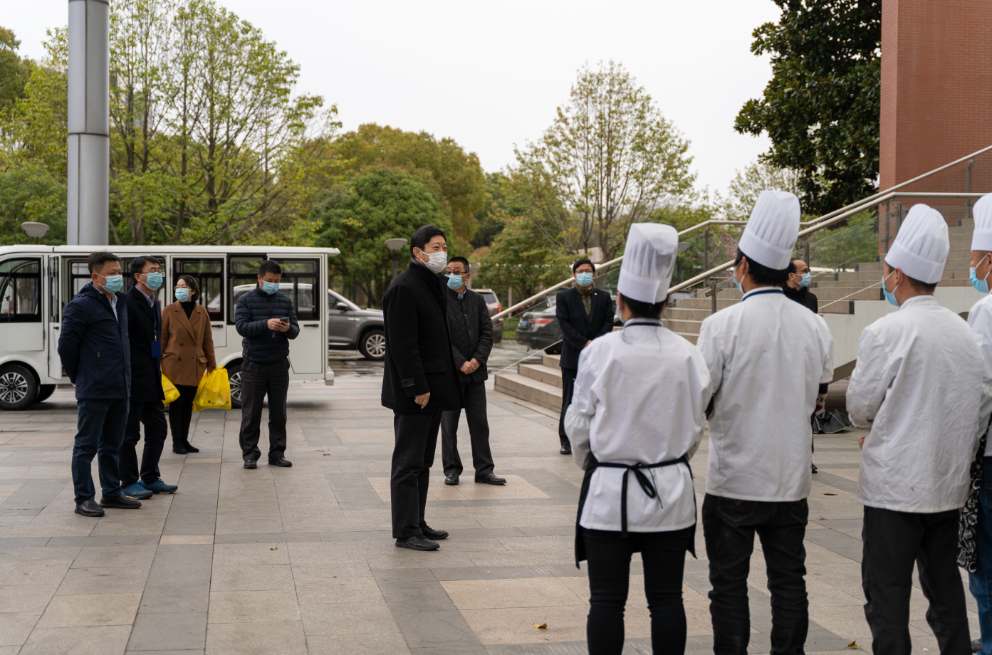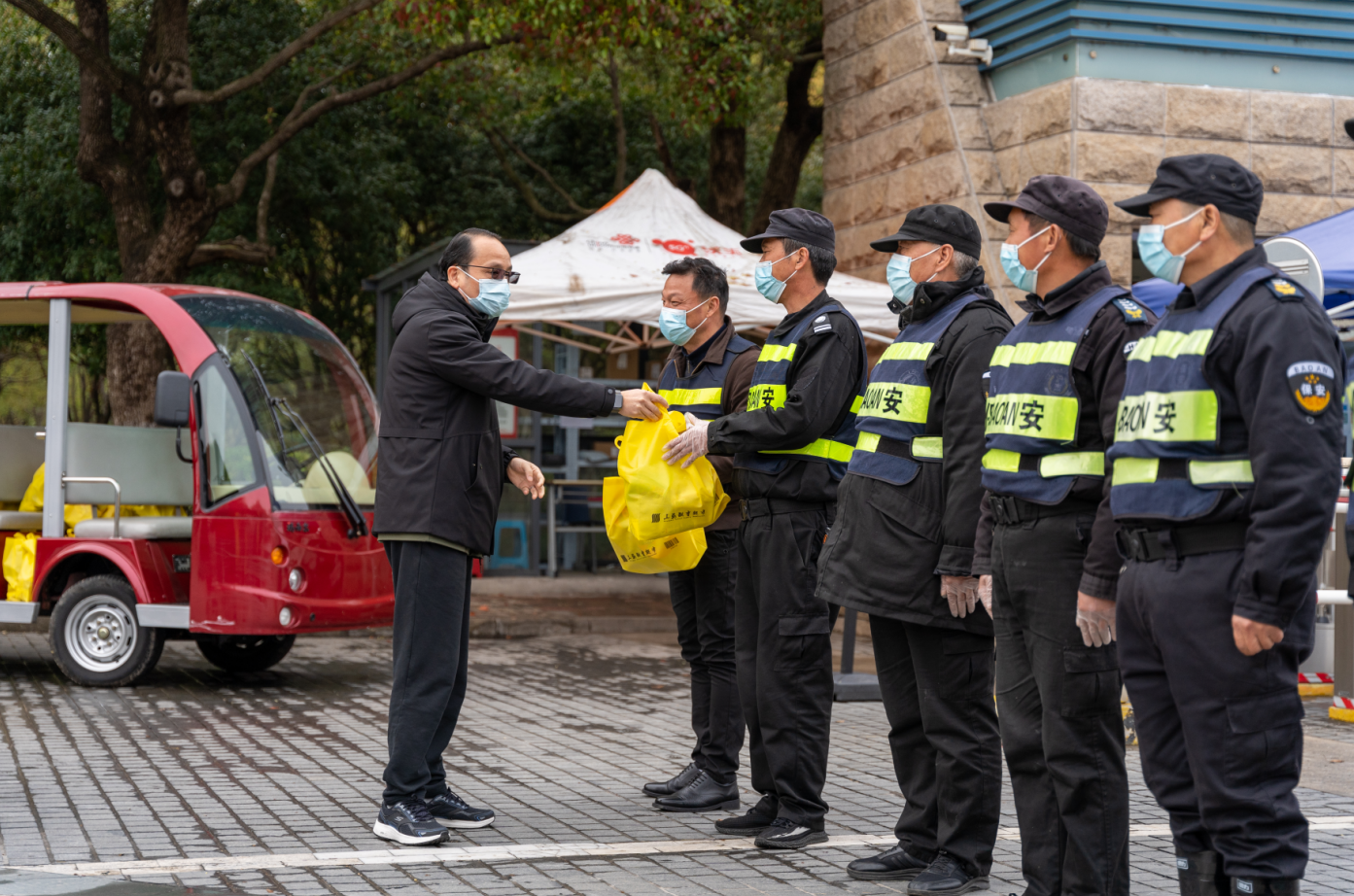校领导一行先后到松江校区门卫岗、食堂、门诊、公寓等地,为坚守岗位的工作人员送去慰问物资,感谢大家在疫情防控工作中的辛勤付出。